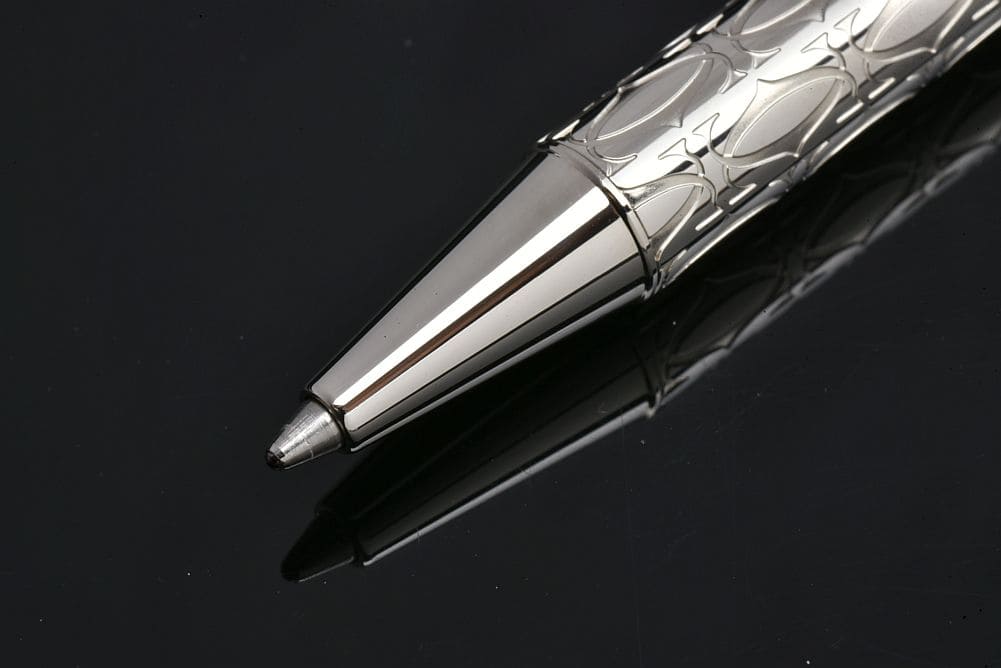 パラジウム仕上げの美しいボディに、アイコニックな「C ドゥ カルティエ」のモチーフがデザインされたボールペンでございます。表面に僅かなスレがございますが、使用感のほとんど無いキレイな状態でございます。 |