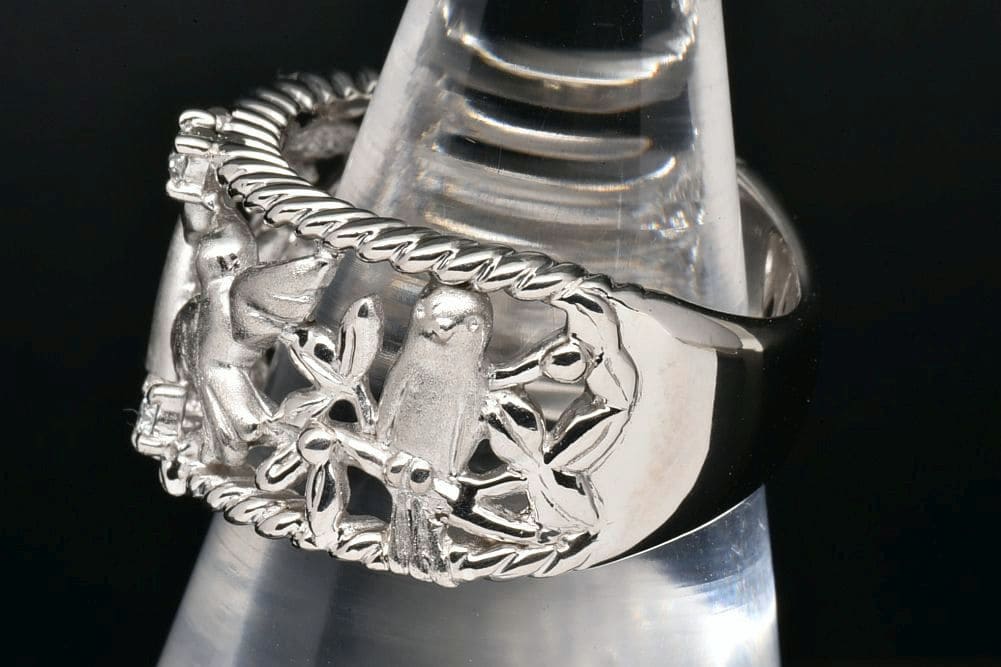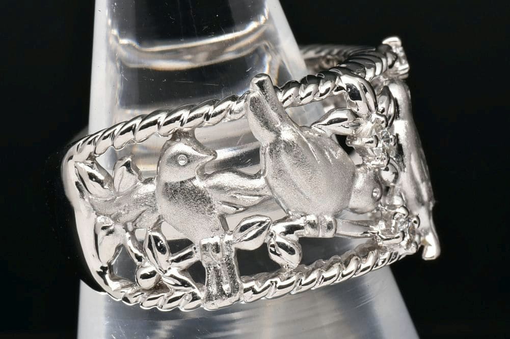 可愛らしい鳥とダイヤモンドがデザインされたリングでございます。仕上げ済みの商品ですので、目立つキズ等の無いキレイな状態でございます。 |