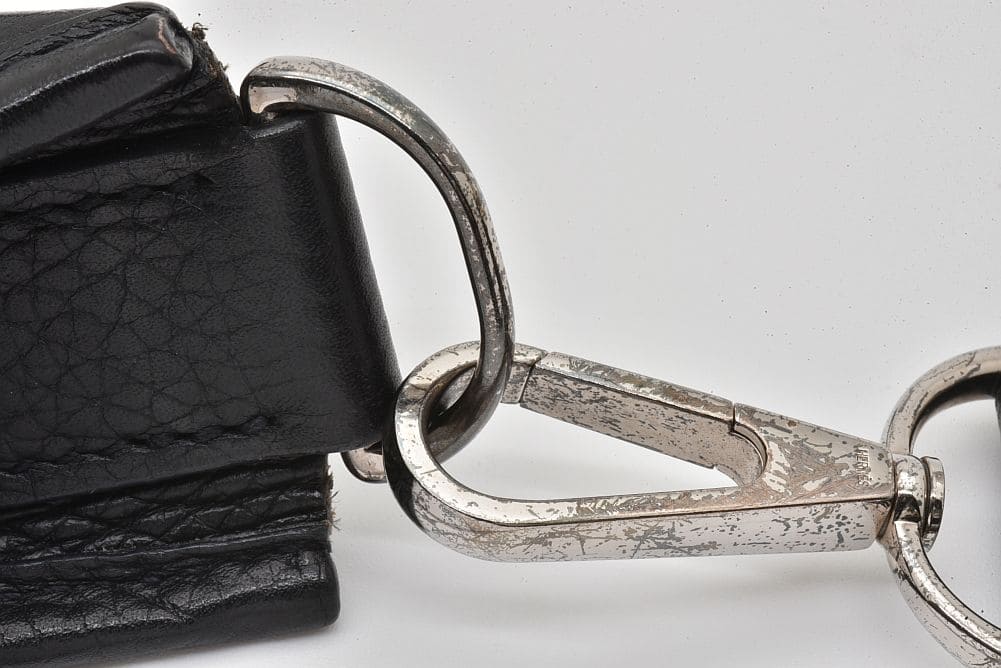 Hロゴがパンチングされ、背面ポケットを備えたショルダーバッグ『エヴリン2 PM』でございます。若干の型崩れや角スレ、開口部の縁にスレが見られます。金具部分にメッキ剥げやキズがあり、全体的に使用感がございますが、まだまだお使いいただける商品でございます。 |