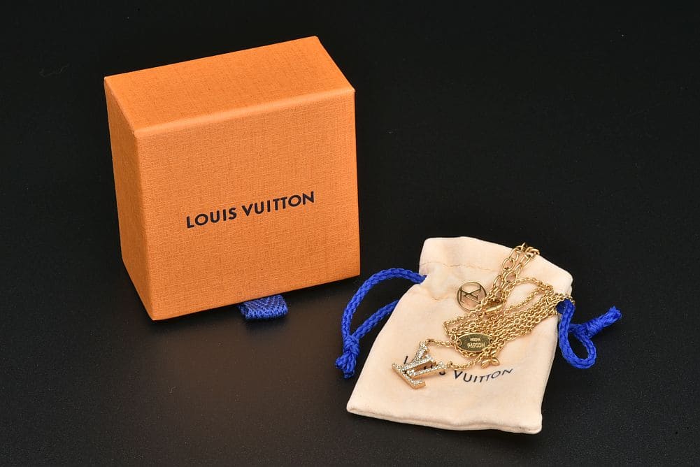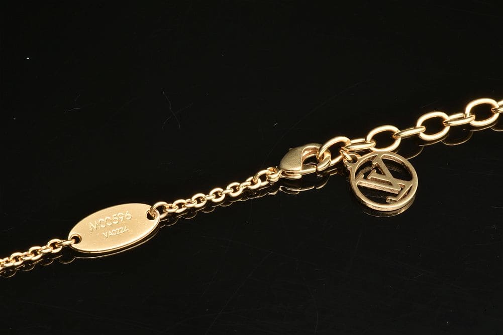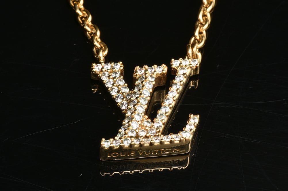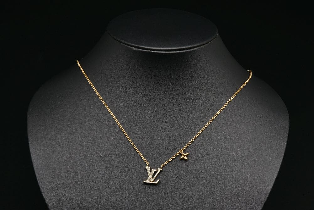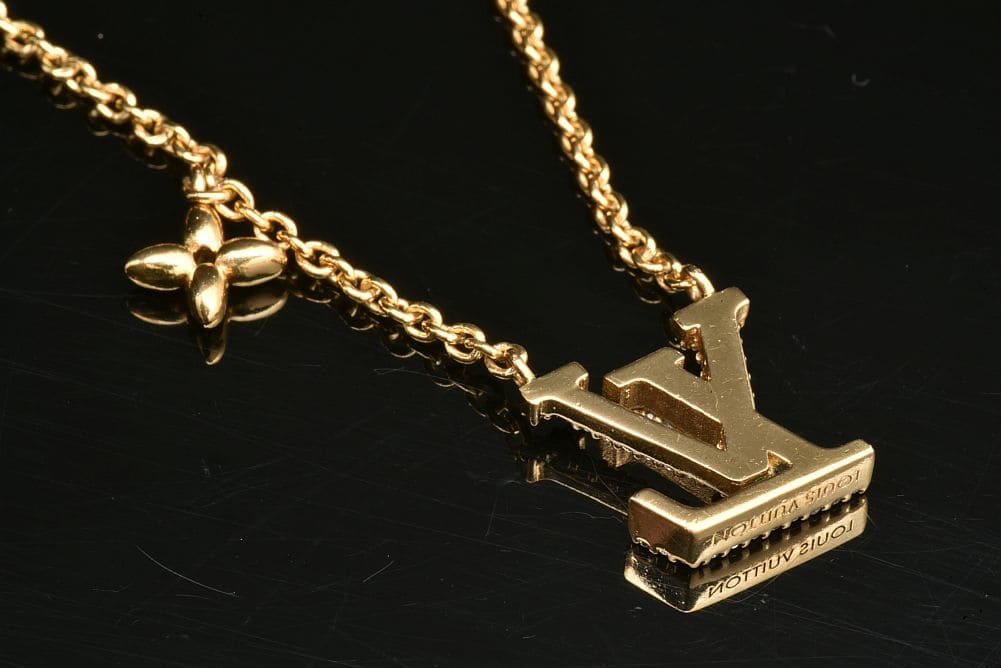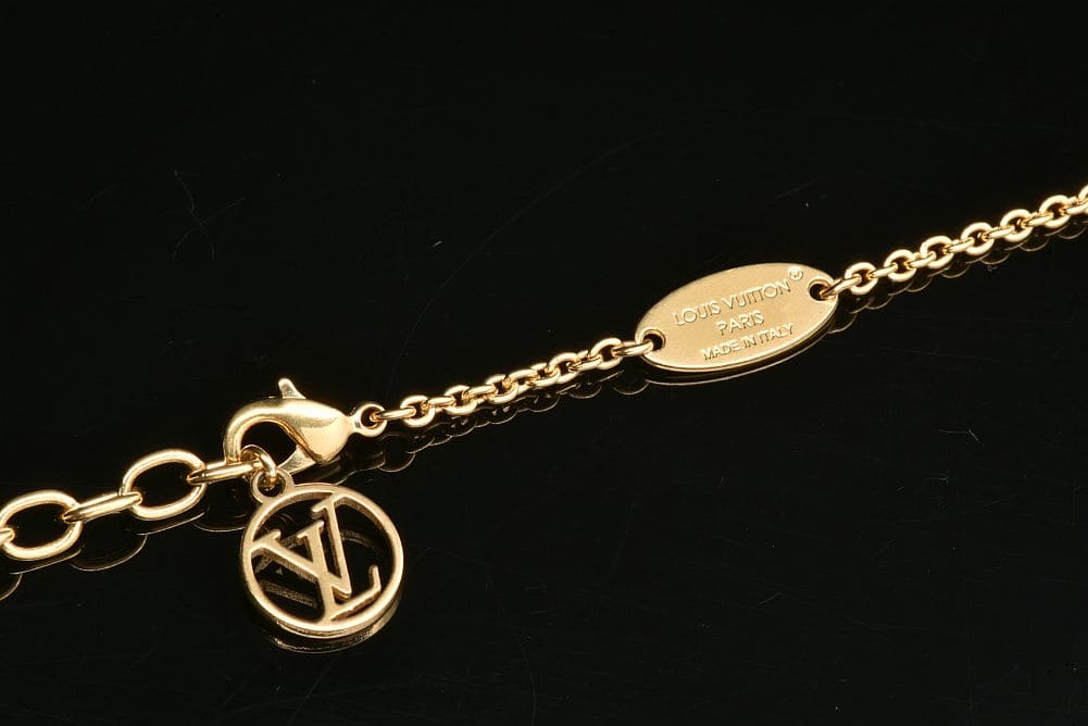 商品説明 | ストラスがセットされたLVモチーフと小ぶりで可愛らしいサイズのモノグラム・フラワーがデザインされた『ネックレス・LV アイコニック』でございます。モチーフや留め具に若干のスレや小キズ、ストラスに僅かなくすみが見られる箇所がございますが、目立つ大きなダメージはございません。 |