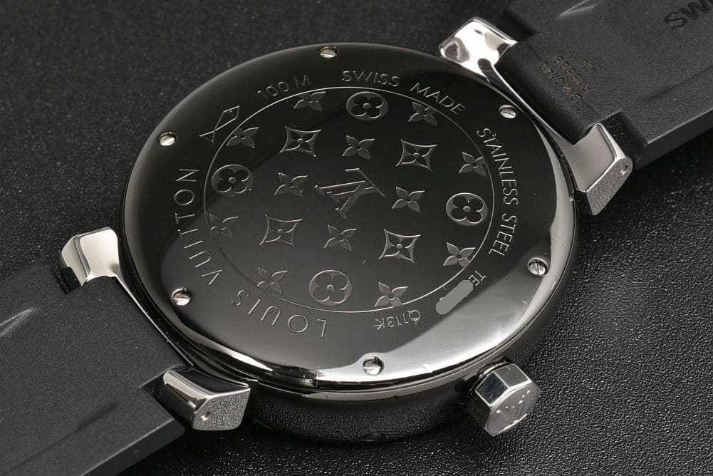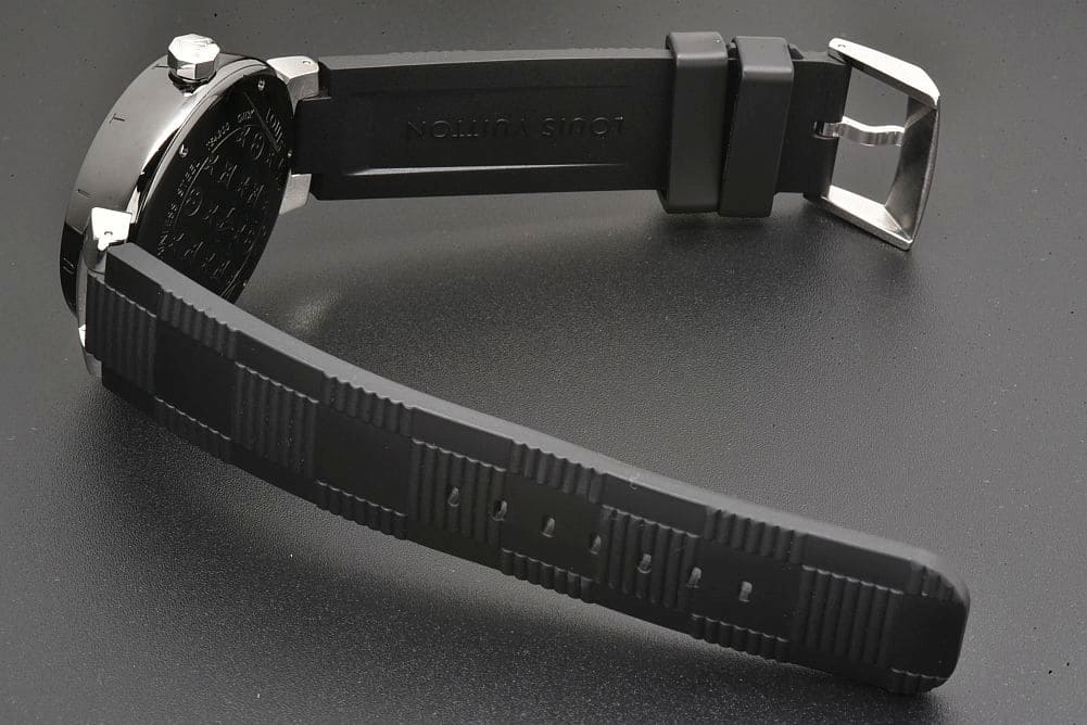 商品説明 | ブラックPVD加工が施されたタンブールGMTオートマチック イン ブラック Q113K でございます。裏蓋やベゼル等にスレや小傷がございますが、気になる深い傷は無く全体的にキレイな状態でございます。ベルトは僅かなヒビがあるものの、まだまだお使い頂ける状態でございます。ガラスコーティングにスレがございます。 |