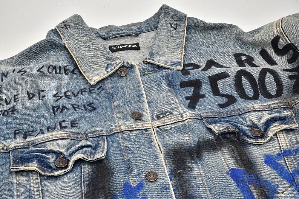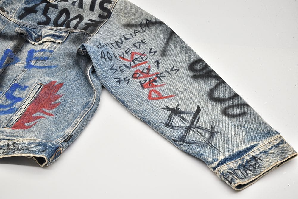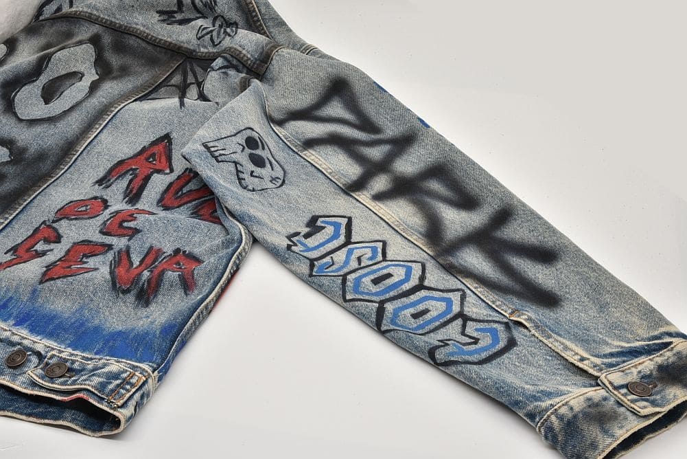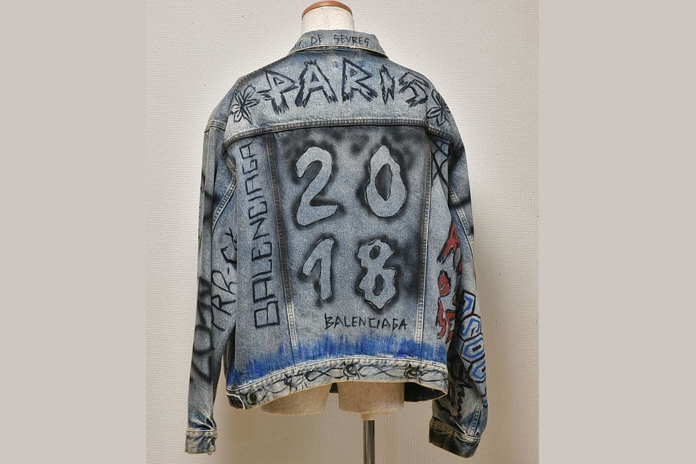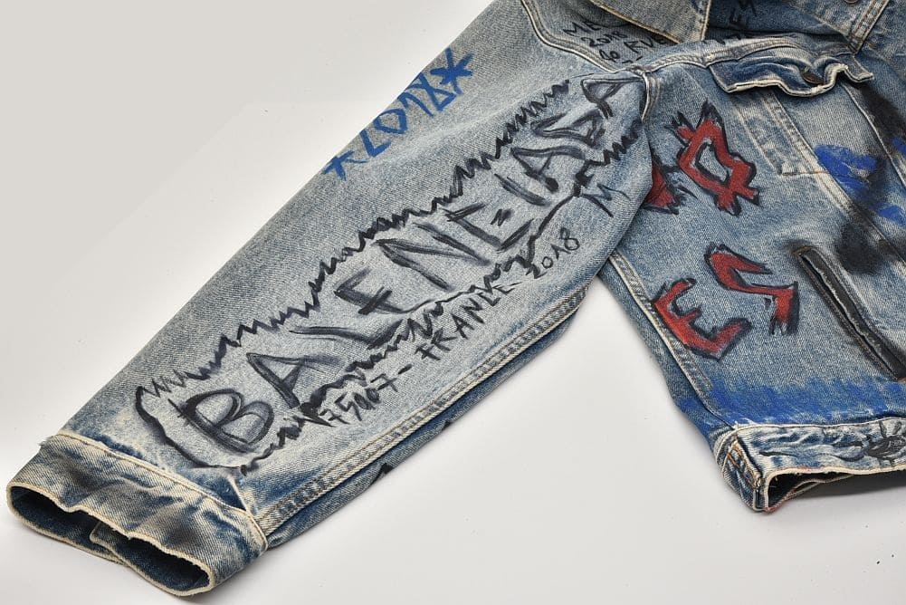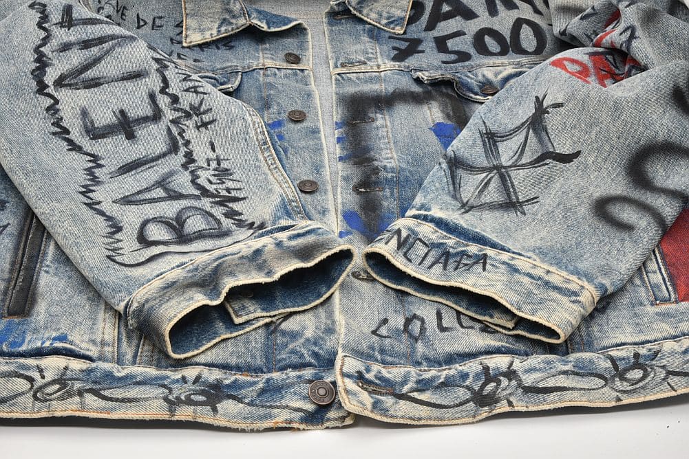 商品説明 | ダメージ加工がされたデニムジャケットに、グラフィティペイントが目を引く『グラフィック デニムジャケット』でございます。少々のスレ等が見られますが目立つ大きなダメージはございません。 |