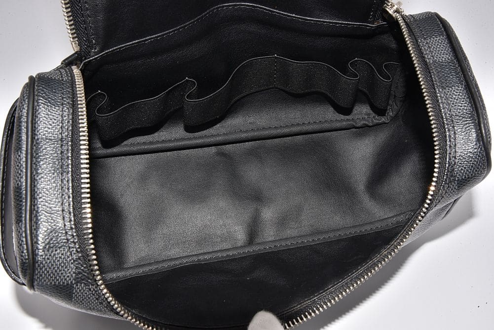 内側のベルトでコスメやボトルなどを収納できる機能的な『トワレ・ポーチ』でございます。角やハンドルにスレ、型崩れやファスナーにスレ・変色が見られますが、内側に目立つダメージはございません。 |