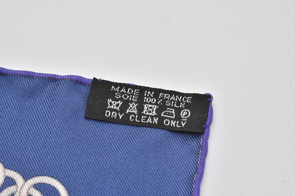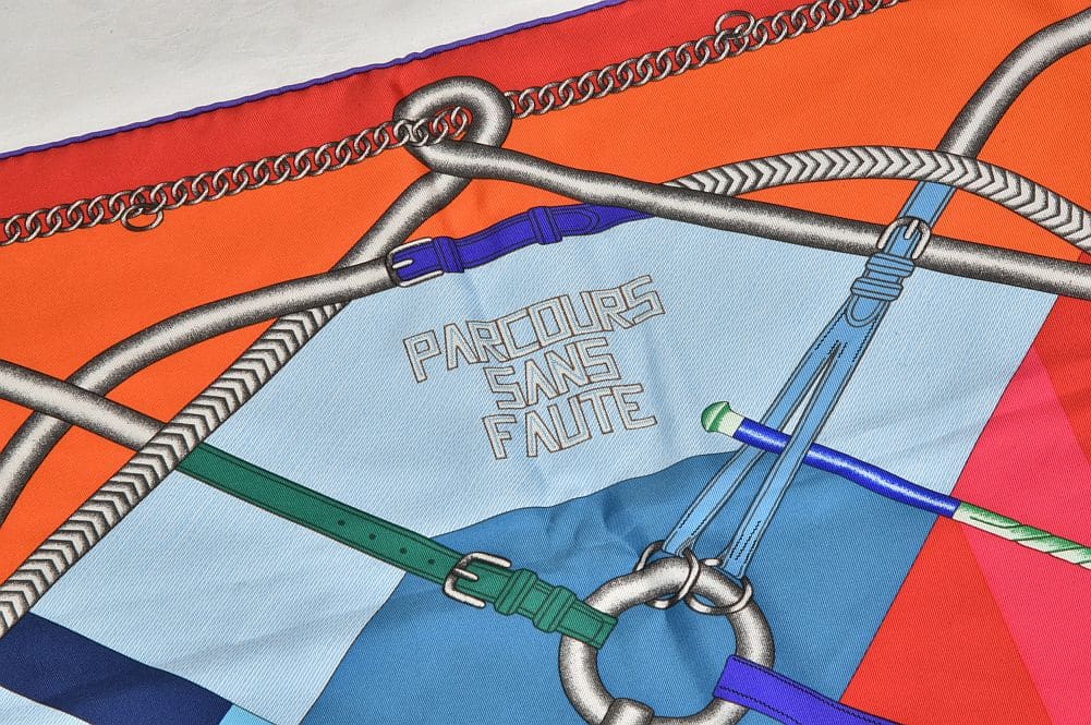 エルメスの馬術競技をテーマにしたスカーフ『カレ90 PARCOURS SANS FAUTE』でございます。僅かな保管ジワがございますが、使用感のほとんど無いキレイな状態でございます。 |