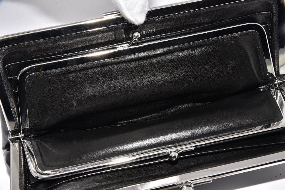 光沢のある艶やかなカウハイドにシンプルなブランドロゴがデザインされた『KISS CLASP がま口財布』でございます。表面に細かなキズ、金具部分にスレが見られます。カードポケットや小銭入れに収納跡がございますが、使用上大きく目立つダメージはございません。 |