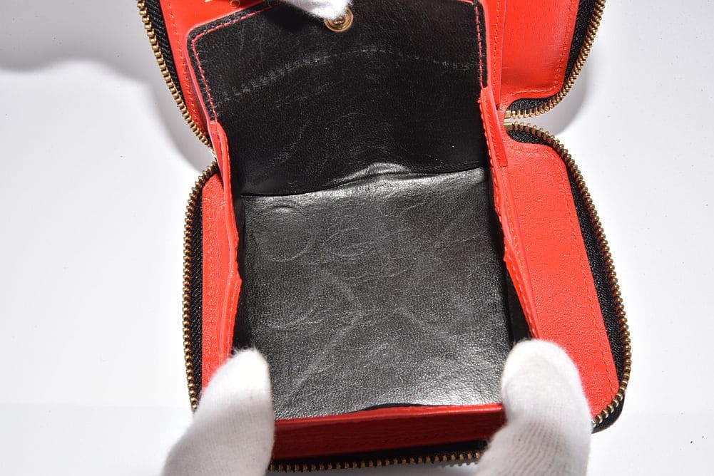 ブランドロゴが大胆にデザインされた『Huge Logo 二つ折り財布』でございます。表面に僅かな角スレやシワ、ファスナー金具に若干の変色が見られます。内側にシワや押し跡、小銭入れやカードポケットに収納跡がございますが、使用上大きく目立つダメージはございません。 |