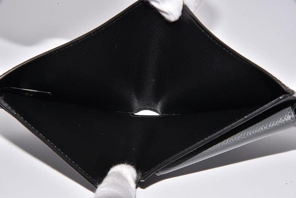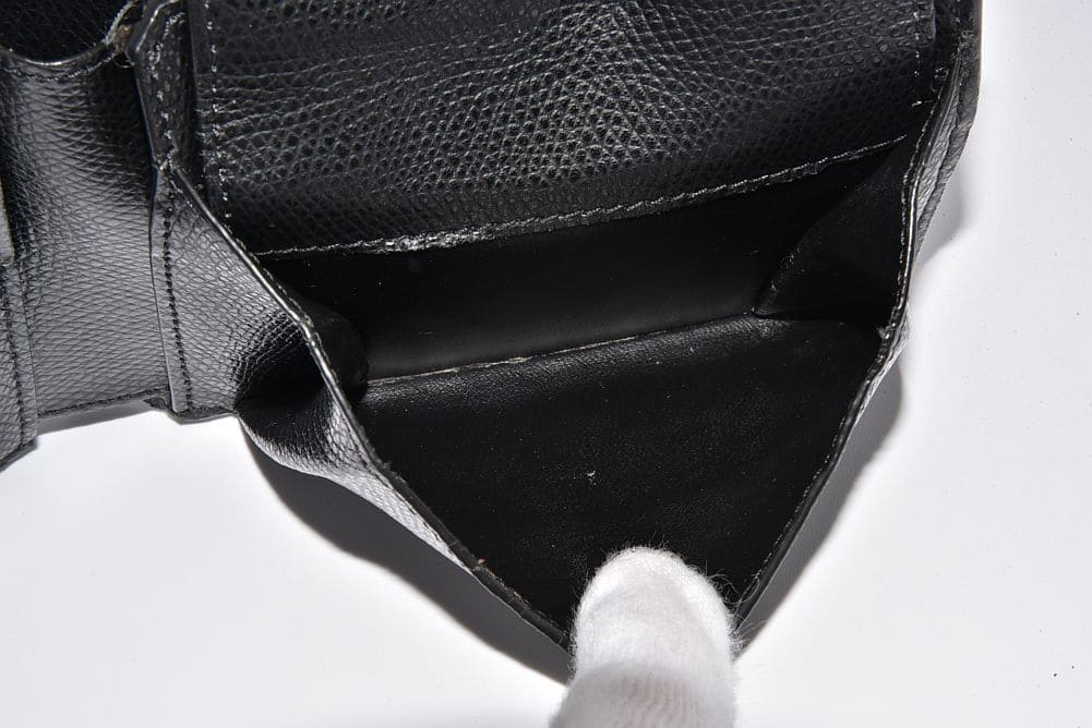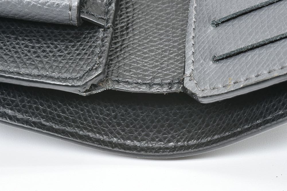 FFモチーフにフロントのブランドロゴが印象的な『バイフォールド コインウォレット』でございます。表面や角にスレ、若干の型崩れや縁のコーティングにひび割れが見られます。小銭入れやカード入れに収納跡、小銭入れ上部に糸の抜けがございますが、まだまだお使いいただける商品でございます。 |