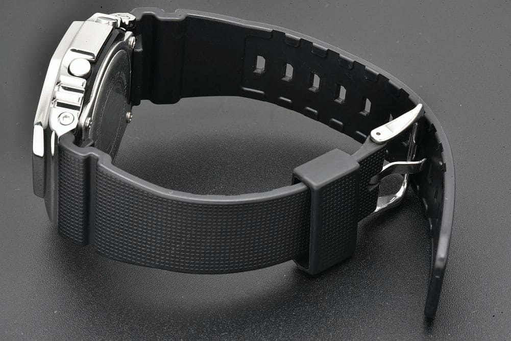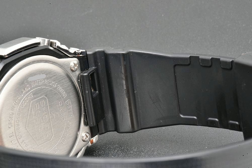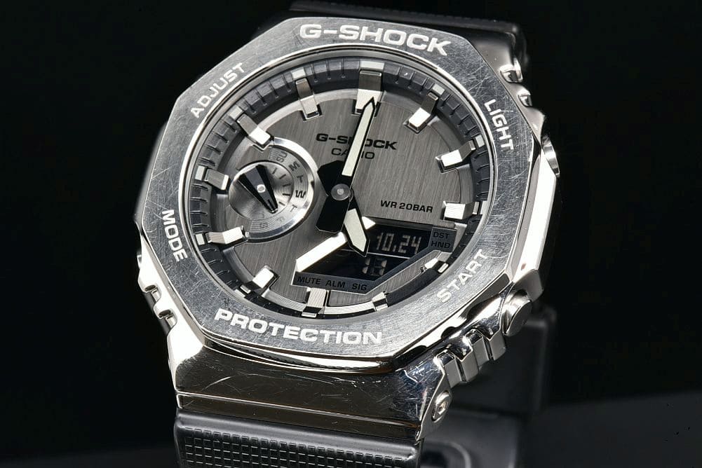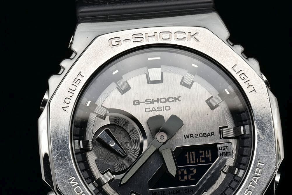 2100シリーズから、八角形ケースが印象的なGM-2100-1Aでございます。ベゼルにスレや小傷がございますが、使用上の問題は無く比較的キレイな状態でございます。ベルトにも使用感があるものの気になるダメージは無くそのままお使い頂けます。ガラスに面傷がございます。 |