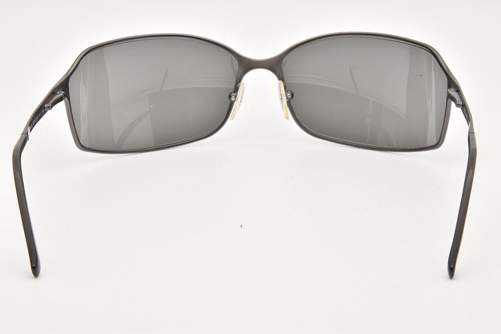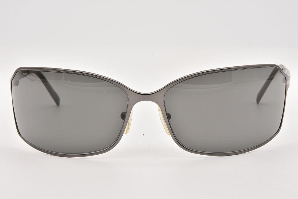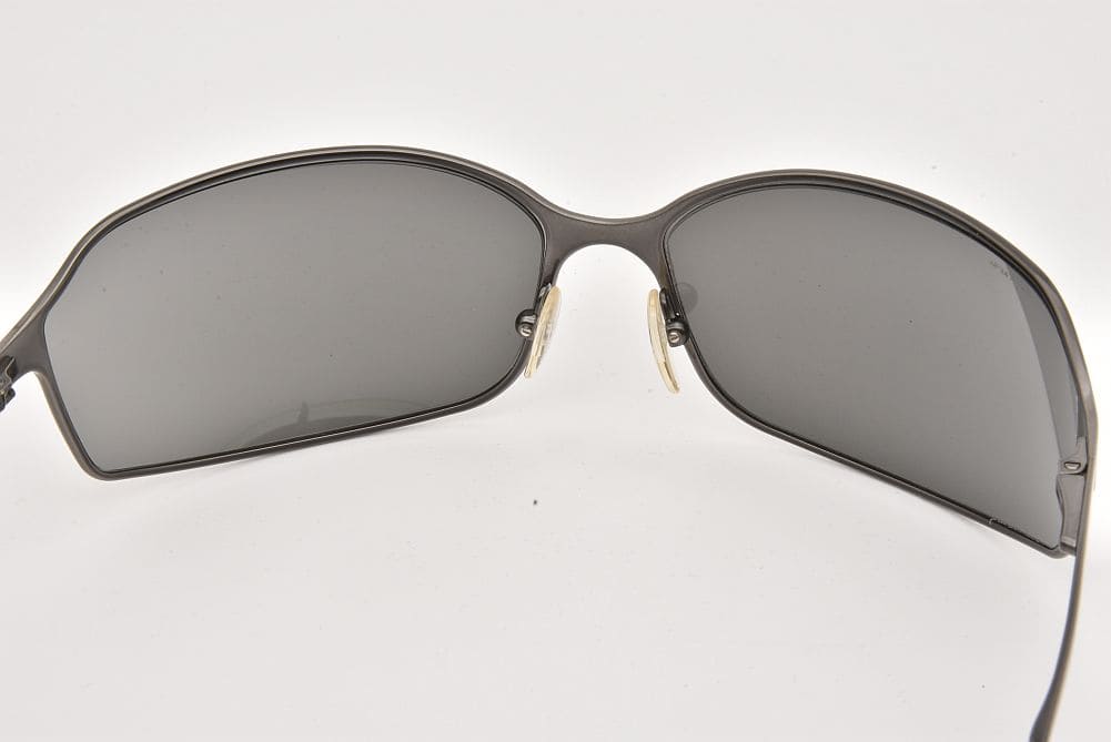 グレーのカーブレンズにメタルフレームが特徴のサングラスでございます。テンプルのロゴに少々のスレ、ノーズパッドに僅かな変色がございますが、目立つダメージはございません。