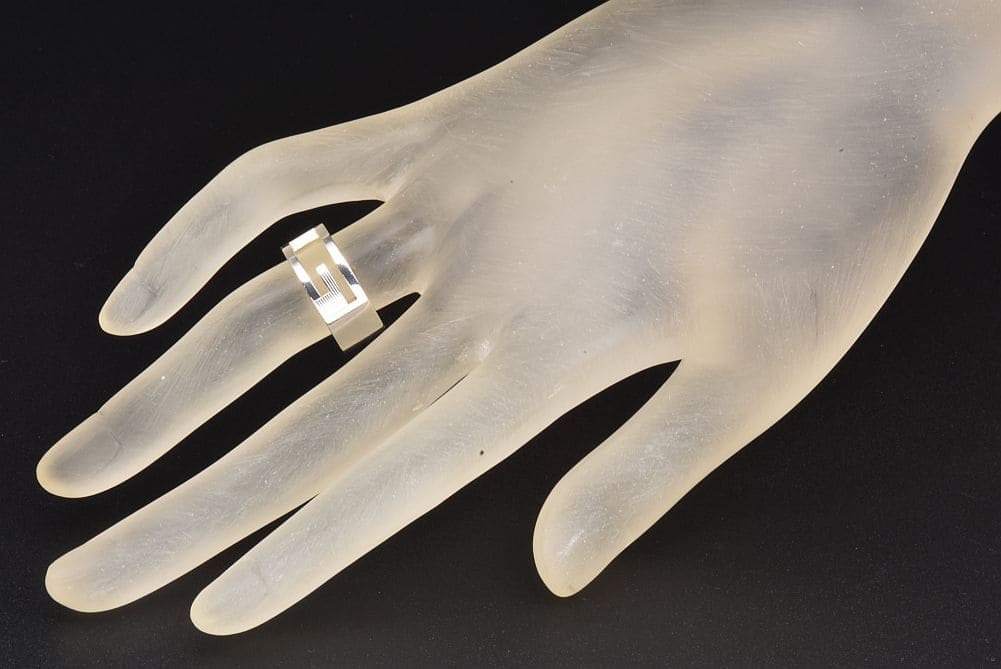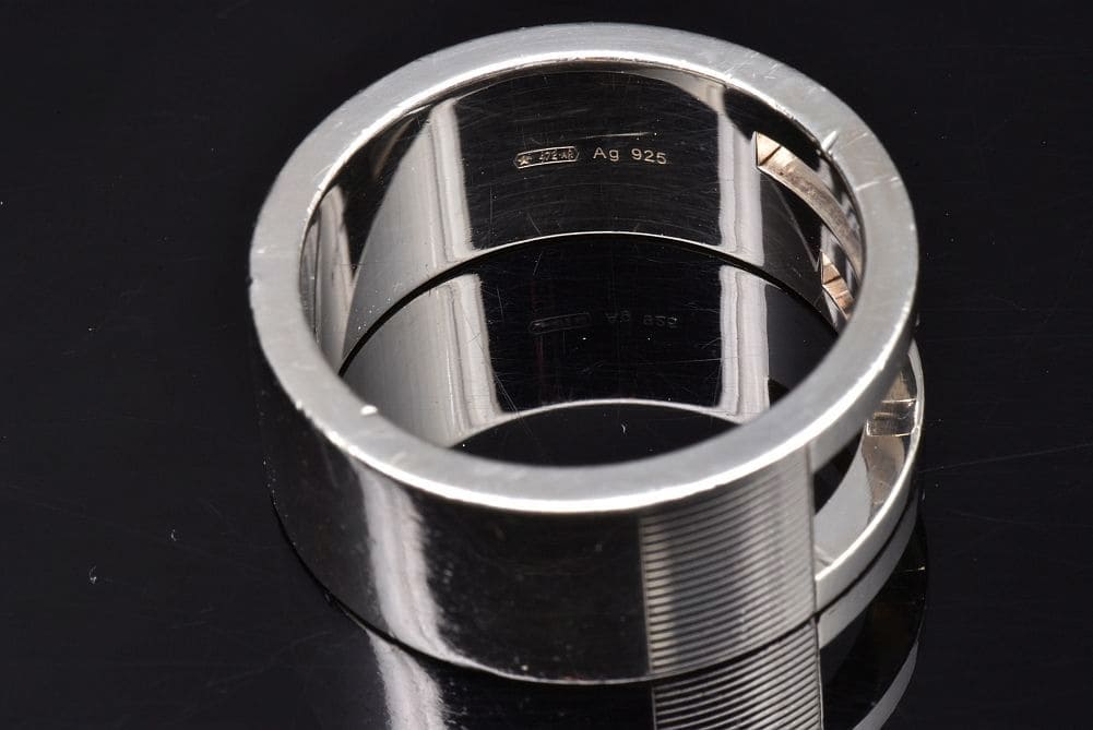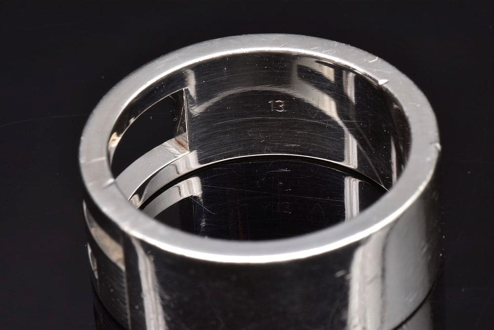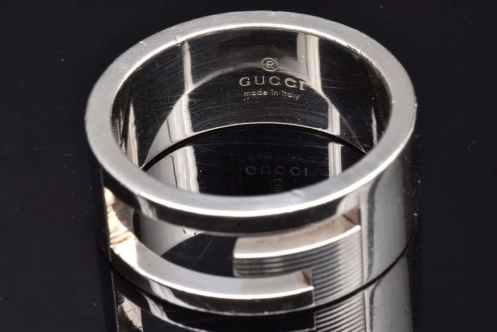 Gモチーフのシンプルなシルバー製のリングでございます。表面に細かなスレや小さな打痕がございますが、使用上大きく目立つダメージはございません。 |