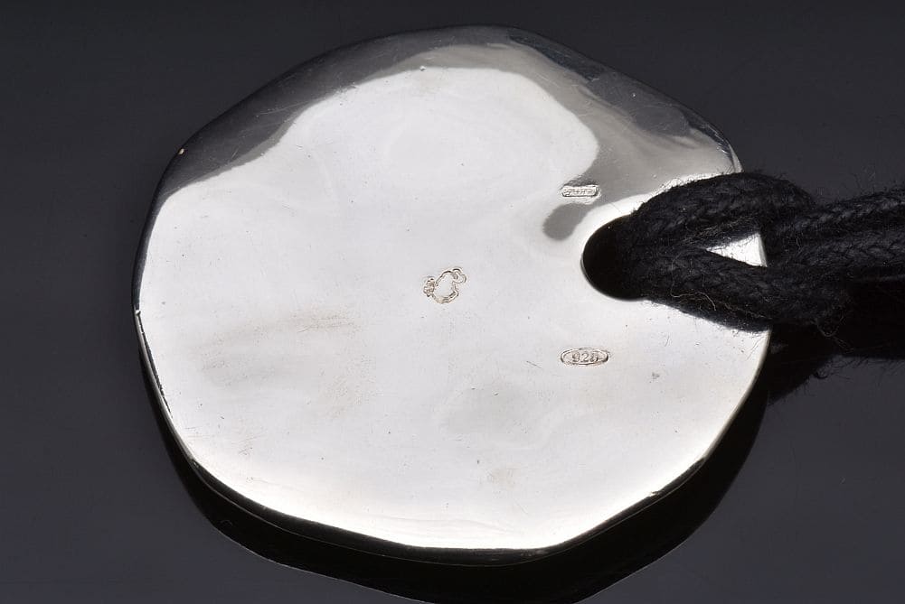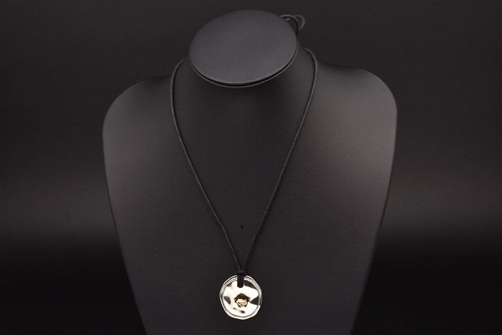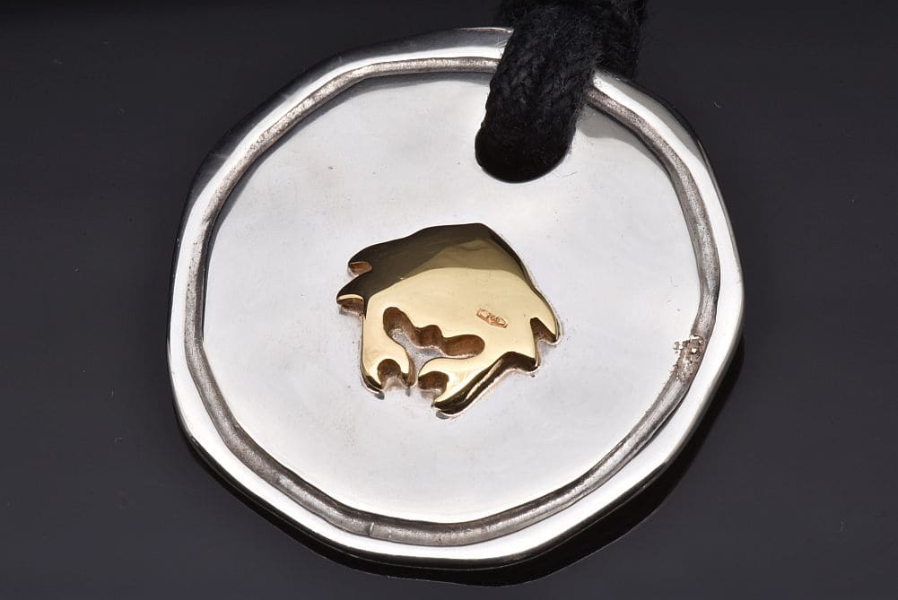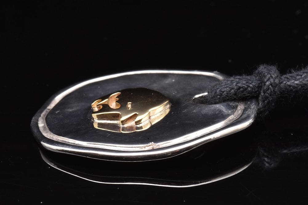 ポメラートのセカンドライン「DODO」のシルバー製のサークルプレートに、K18製のカニモチーフをあしらったペンダントネックレスでございます。表面に少々のスレや溝にキズが見られます、コードに僅かな毛羽立ちがございますが、大きく目立つダメージはございません。 |