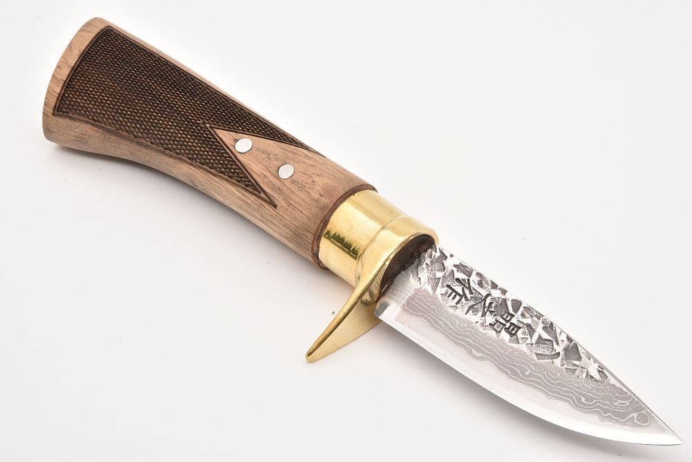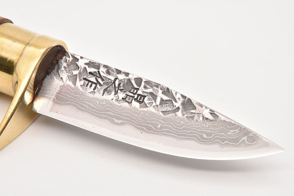 鍛冶屋トヨクニ 晶之作土佐鍛 ダマスカス豆山遊鉈80mm 剣鉈 槌目磨 真鍮ツバ サバイバルナイフ 青2鋼 両刃 bip-808【新品同様 】