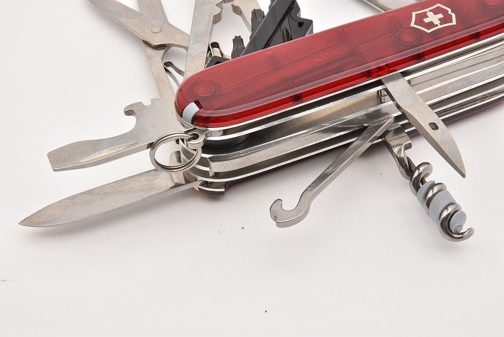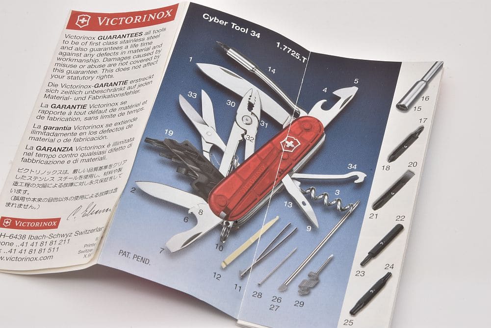 32の機能を搭載しながらもコンパクトでアウトドアや災害時に活躍する、実用的なアーミーナイフ『サイバーツール M』でございます。表面に僅かな展示スレがございますが、未使用の状態でございます。 |