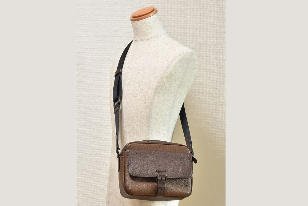 シンプルなデザインと機能性を兼ね備えた『ハドソン クロスボディバッグ』でございます。金具部分やファスナーに細かなスレや変色、ショルダーに若干の色褪せが見られる箇所がございますが、全体的に使用感の少ないキレイな状態でございます。 |