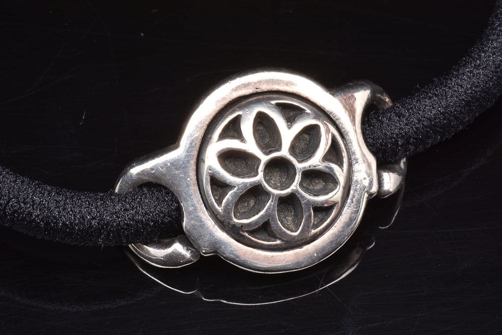 アイコンの「ロゼット」がデザインされたヘアバンドやマネークリップ、ゴムを取り外してスニーカーのレースロックと幅広い使い方できる商品でございます。モチーフに細かなキズやくすみが見られますが目立つダメージはございません。※社外新品ゴムに交換してあります。 |