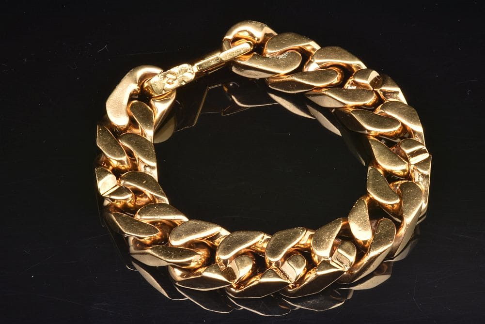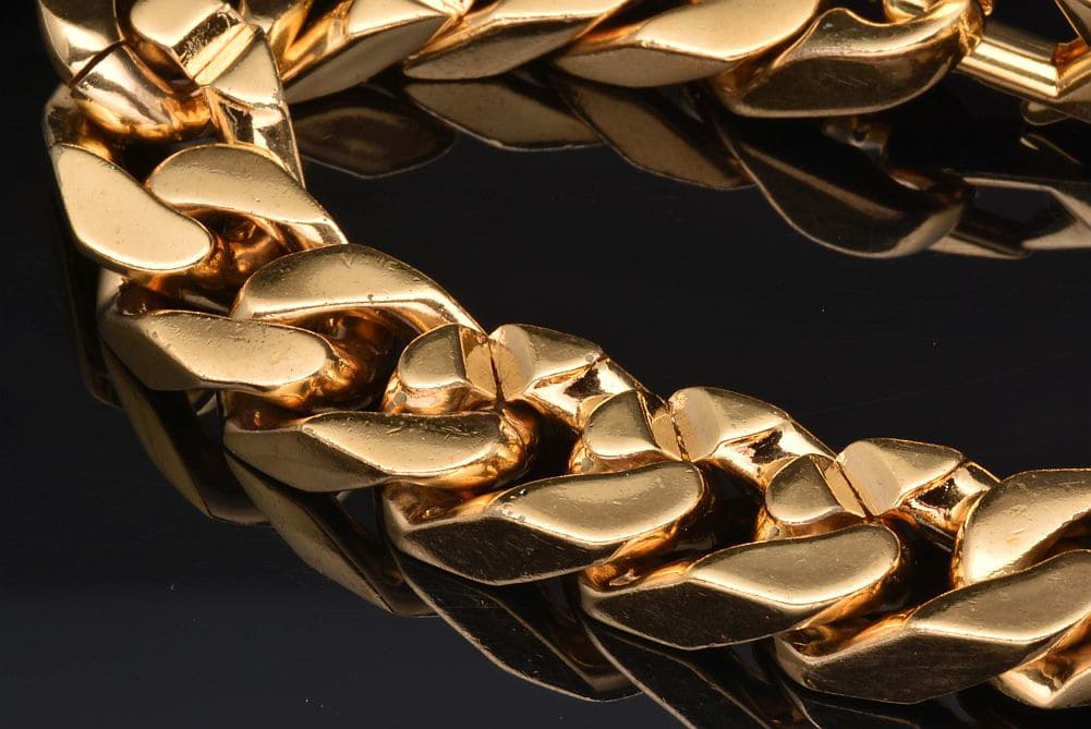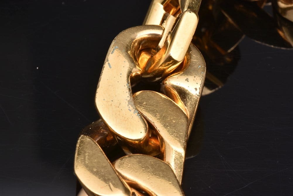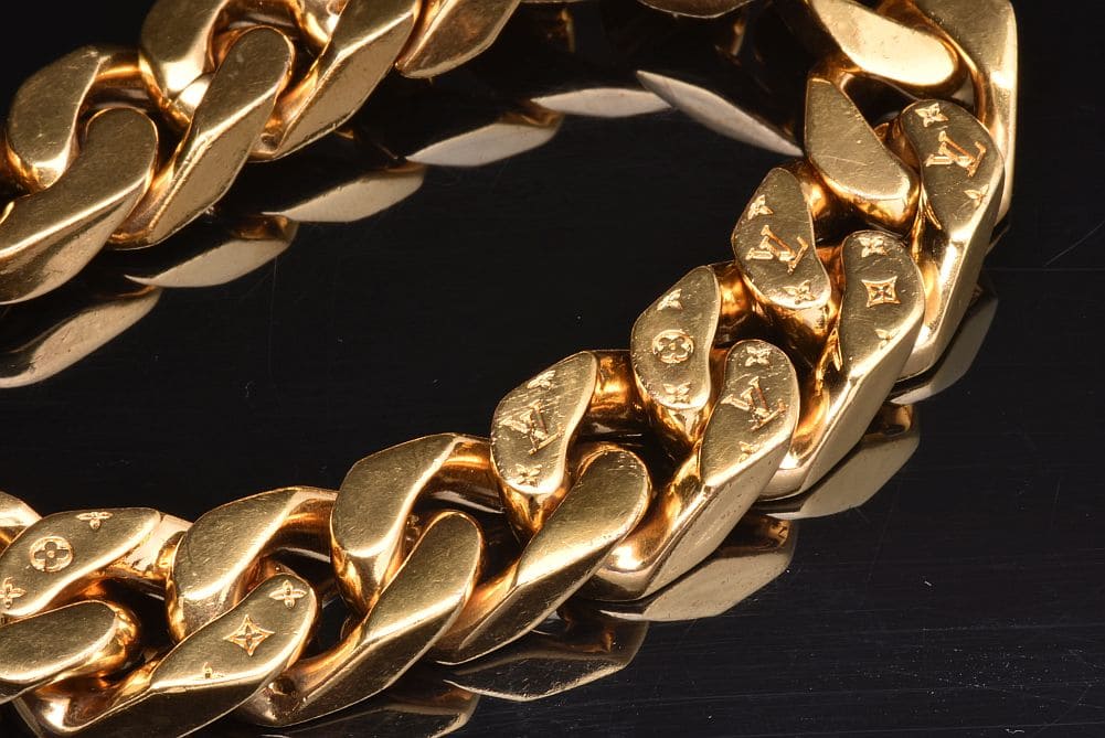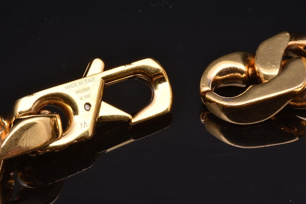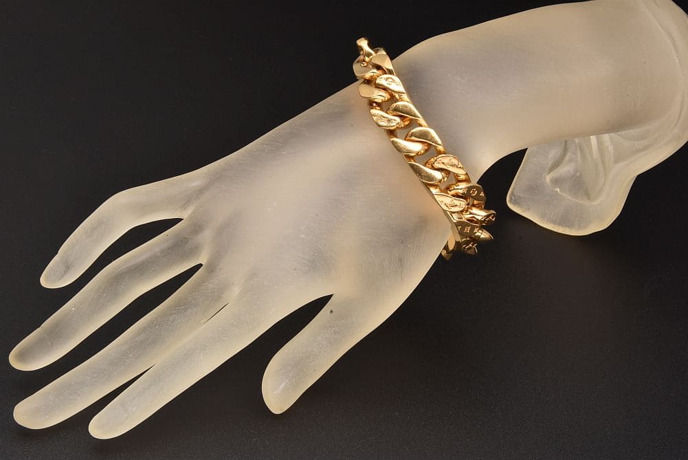 アイコニックな「モノグラム・パターン」が彫られた存在感のある『ブラスレ・チェーンリンクス』でございます。全体的にスレや細かなキズ、僅かなメッキの剥がれが見られますが使用上大きく目立つダメージはございません。 |