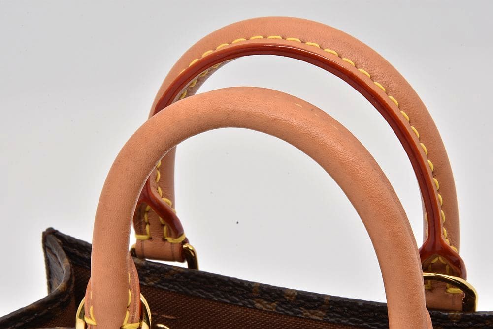 取り外し可能なショルダーストラップで機能的にお使いいただける、コンパクトなサイズの『プティット・サックプラ』でございます。若干の型崩れやハンドルに若干の薄いシミが見られますが、目立つダメージはございません。 |