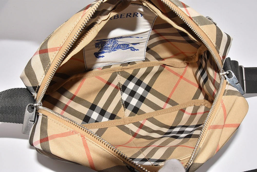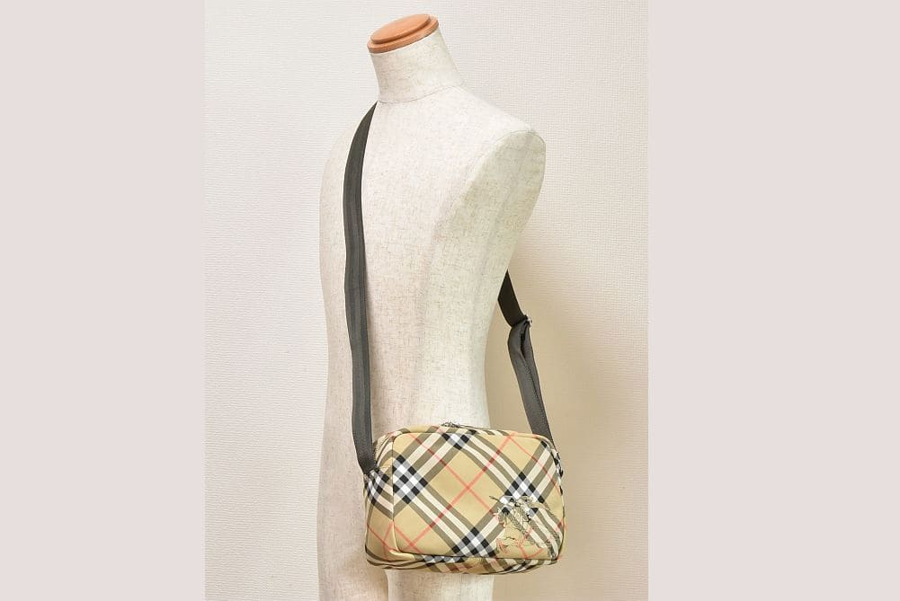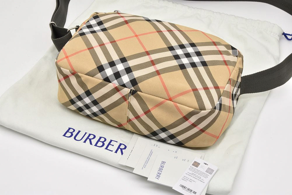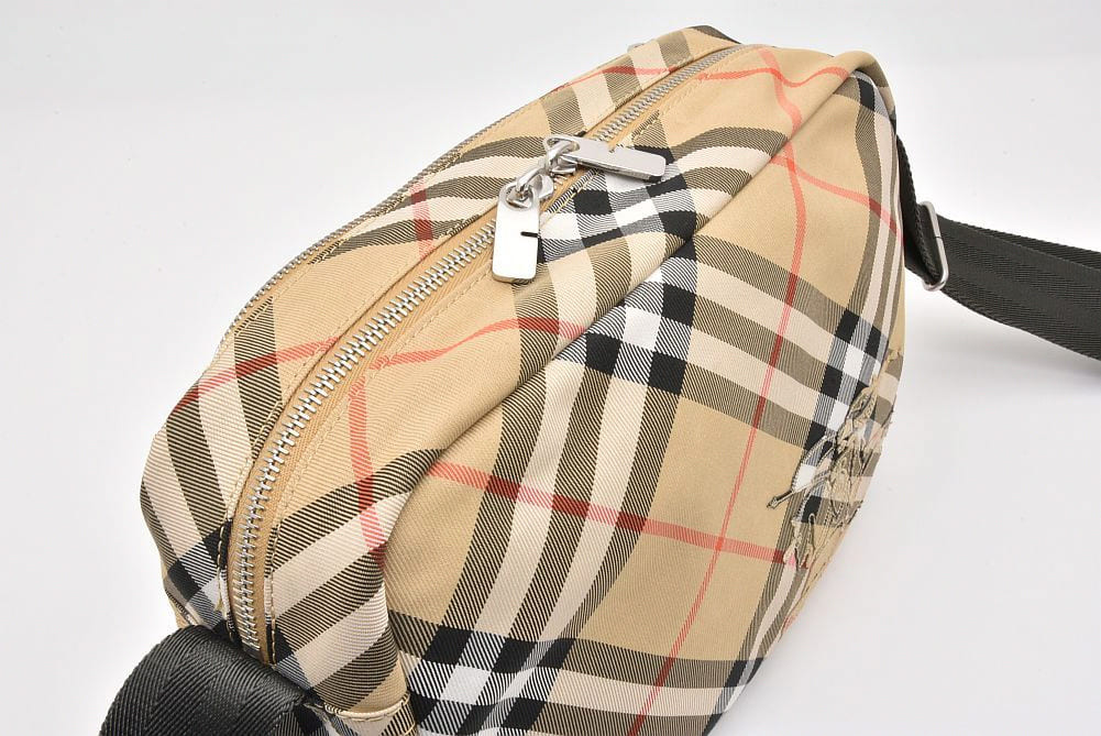 バーバリーチェックに「馬上の騎士」がデザインされた『チェック クロスボディバッグ』でございます。若干のシワや表面に薄いスレが見られますが、使用感の少ないキレイな状態でございます。 |