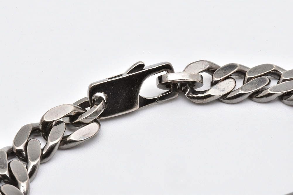 カットアウトGモチーフのブレスレットをブラック加工したシックなデザインのチェーンブレスレットでございます。全体的に少々のスレや細かなキズ、メッキの剥がれが見られますが使用上目立つダメージはございせん。 |