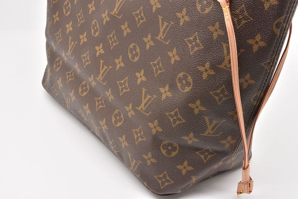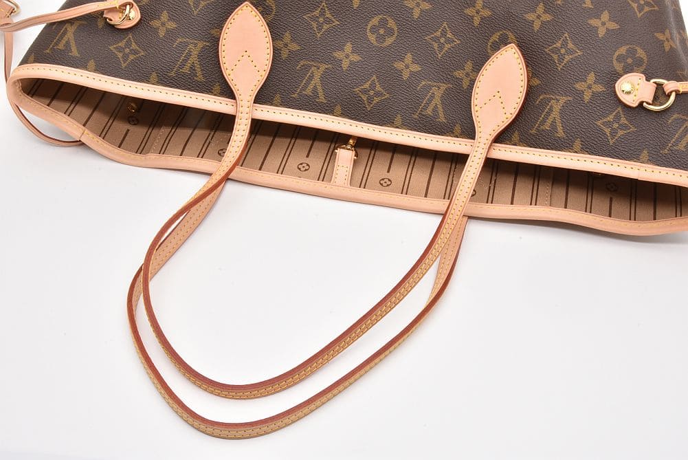 軽量で機能的なトートバッグ『ネヴァーフルMM』でございます。少々の型崩れやヌメ革部分に色ヤケやクセが見られますが、使用感の少ないキレイな状態でございます。 |