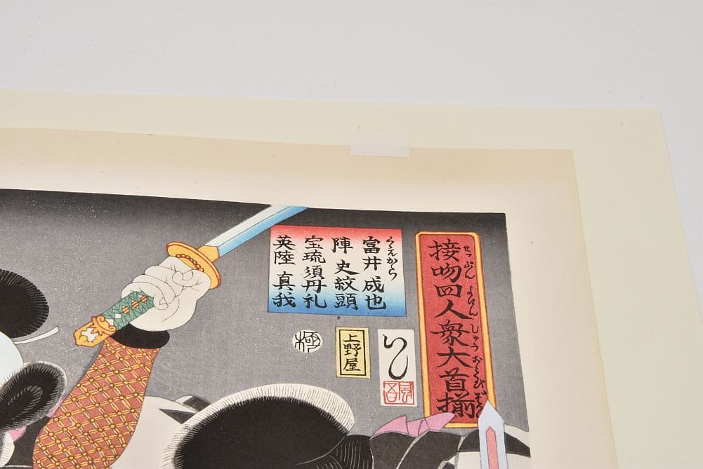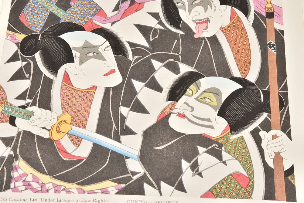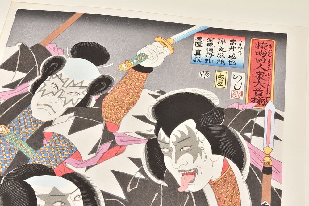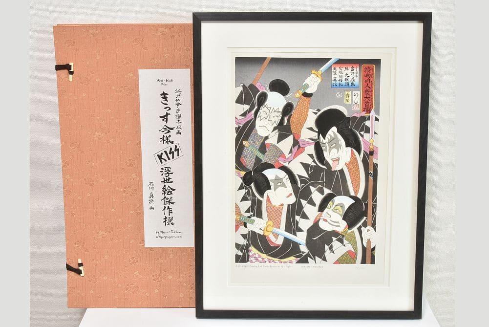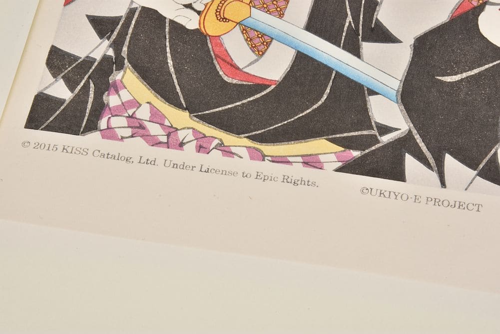 | 商品説明 | 題名通り、本作品はメンバー4人の大首を合わせた構図。着物の柄は赤穂浪士をベースにしています。本来は白い部分を鼠色に雲母(きら)で光沢をだし、KISSらしさを表現しました。鎖帷子の中の色はメンバーそれぞれのイメージカラーにしています。メイクの色合いは、あえて実際より薄くして歌舞伎の隈取りの様に仕上げました。本作品は、一点一点、手作業で制作されています。そのため、摺り上がりの調子が微妙に変わりますが、木版画の特徴の一つでもありますので、独特の風合いとしてお楽しみください。絵の縁に僅かな変色、額装アクリル板に少々のスレが見られます。 |