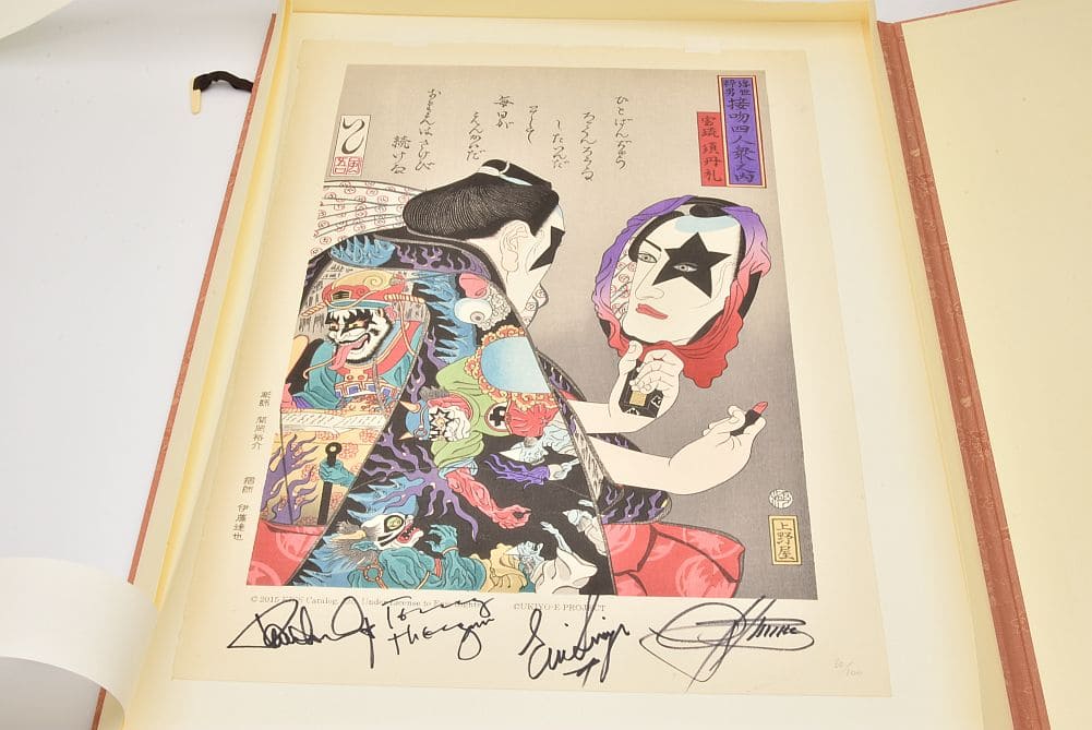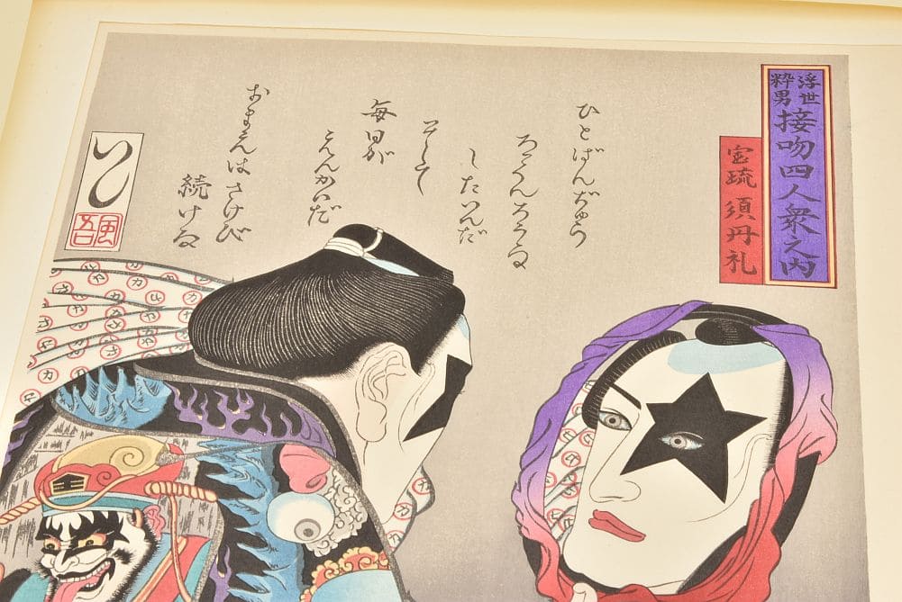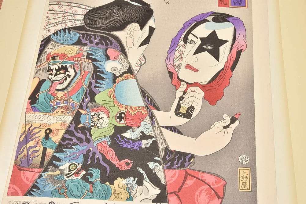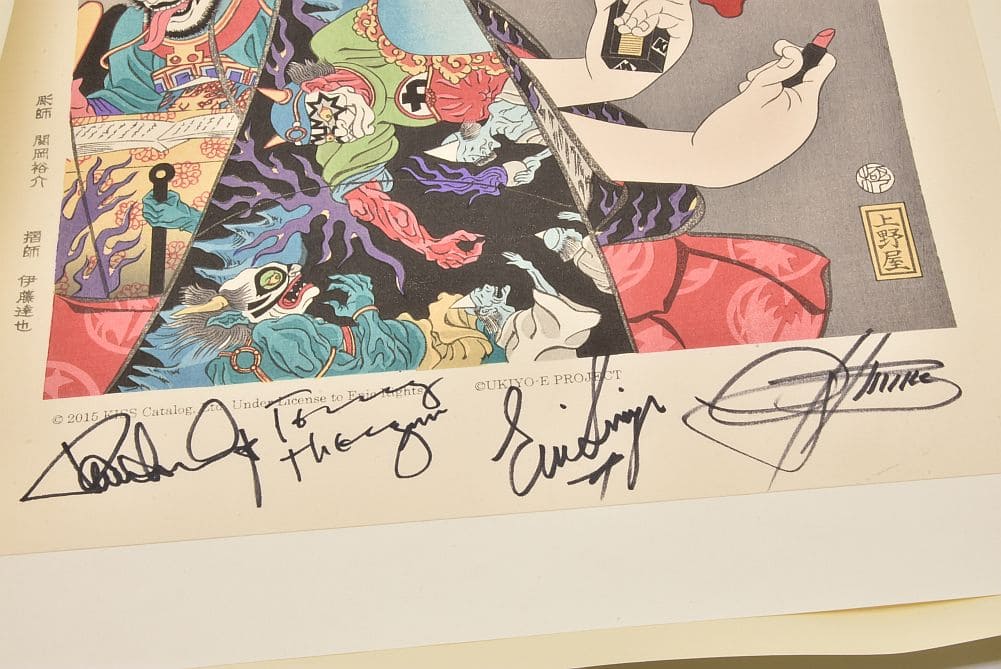 | 商品説明 | 歌川国芳の「国芳もやう正札附現金男 唐犬権兵衛」をベースに、ポール・スタンレーがメイクをしている様子をイメージして作成。着物の柄は地獄変妖図でジーン・シモンズを閻魔大王に、トミー・セイヤー、エリック・シンガーを鬼に見立てています。帯の柄はエリック以外の家紋風マークにし、肩に掛けた手ぬぐいの柄をエリックのベストに施されている「○に力の字模様」にしました。背景には代表曲「Rock and Roll All Nite」のサビ部分を和訳で表現しました。本作品は、一点一点、手作業で制作されています。そのため、摺り上がりの調子が微妙に変わりますが、木版画の特徴の一つでもありますので、独特の風合いとしてお楽しみください。 |