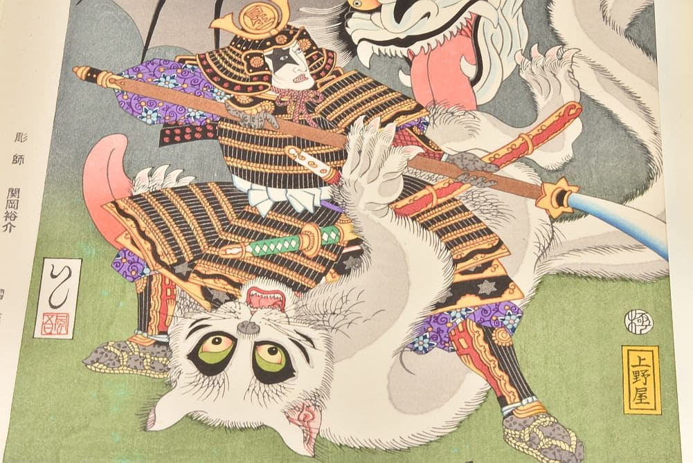 | 商品説明 | 四人を妖怪と武者に見立てた妖怪絵です。ジーン・シモンズは空飛ぶ大顔の悪魔。エリック・シンガーはキャラクター設定の通り、猫をベースにした妖怪「猫又」。トミー・セイヤーは、目から光線を出す妖怪「塗佛」。ポール・スタンレーはそれらを迎え撃つ武者で、ペルソナ名の「スターチャイルド」に因んで兜の前立てを星の字にしています。本人のメイクは五芒星という星形ですが、甲冑膝上辺りの星模様は魔除けの意味のある六芒星にしてあります。本作品は、一点一点、手作業で制作されています。そのため、摺り上がりの調子が微妙に変わりますが、木版画の特徴の一つでもありますので、独特の風合いとしてお楽しみください。 |