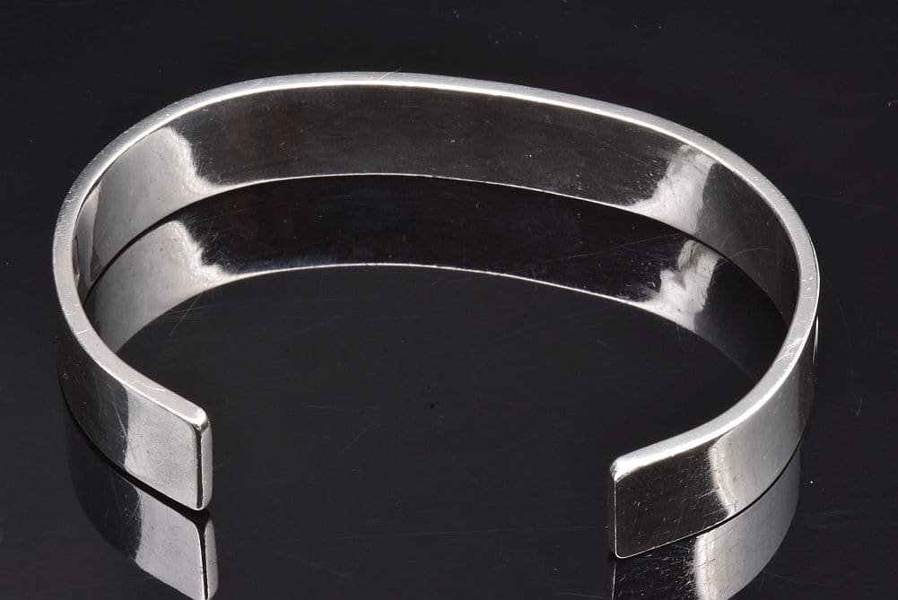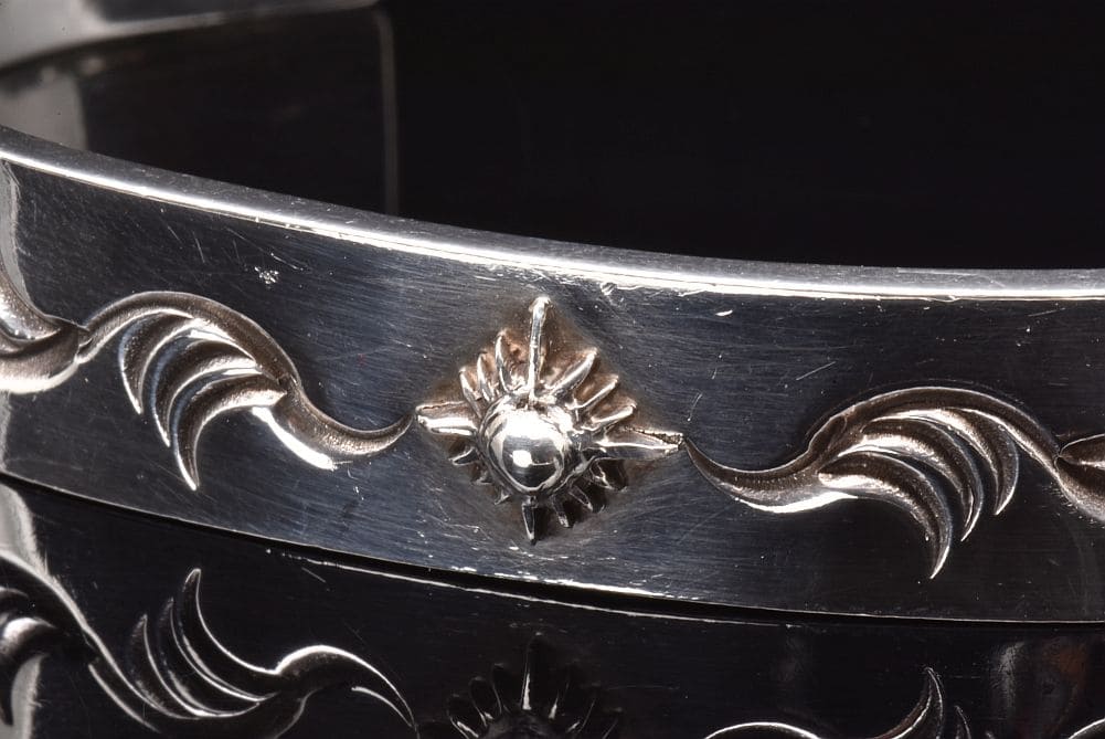 太陽神と唐草模様がデザインされたシルバー製のブレスレットでございます。表面に細かなキズやスレがございますが、目立つダメージはございません。 |