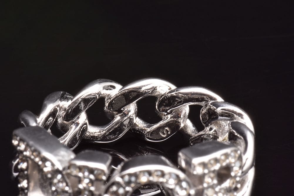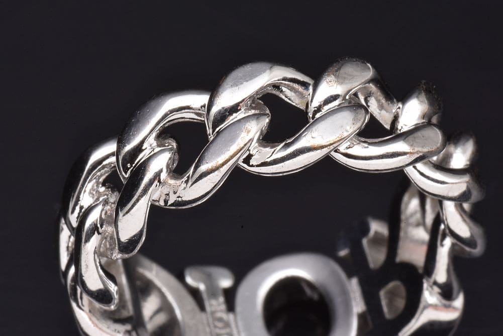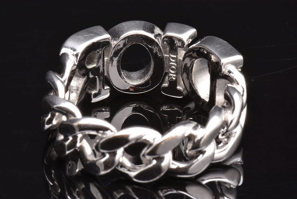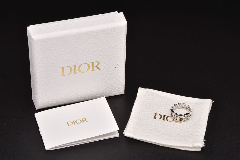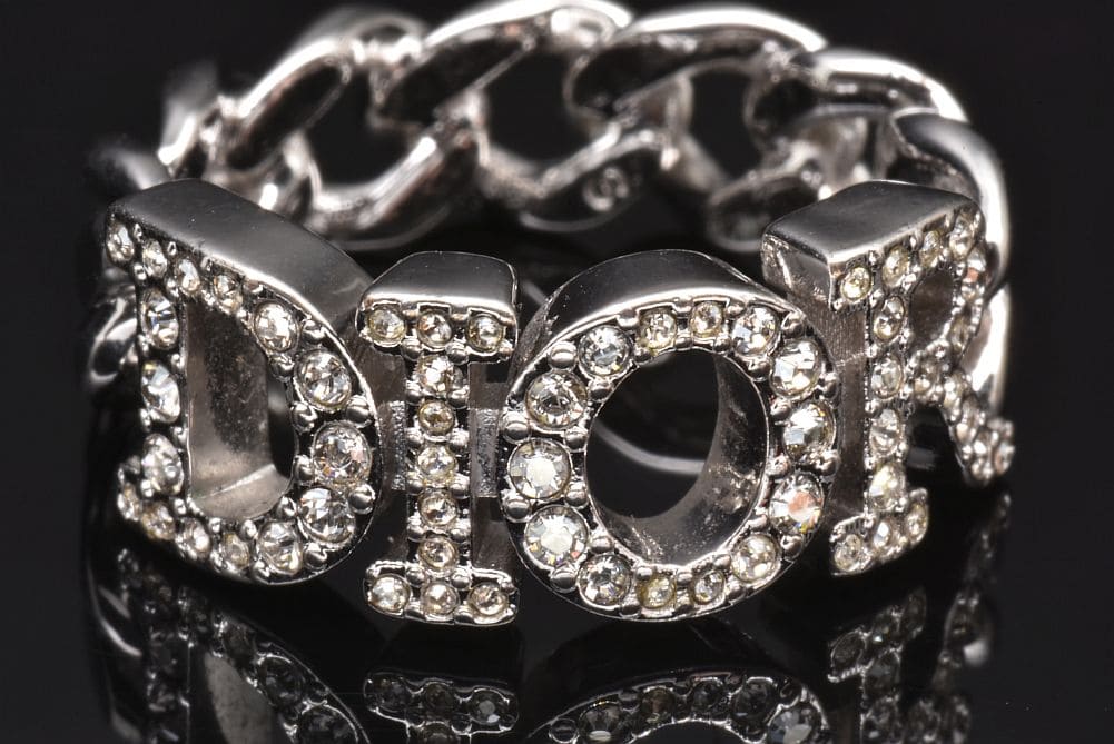 シルバートーンメタルのリンクデザインに、クリスタルをパヴェセッティングしたDiorシグネチャーをあしらった『Dio(r)evolution リング』でございます。表面に少々のキズやメッキの剥がれございますが使用上目立つものではございません。 |