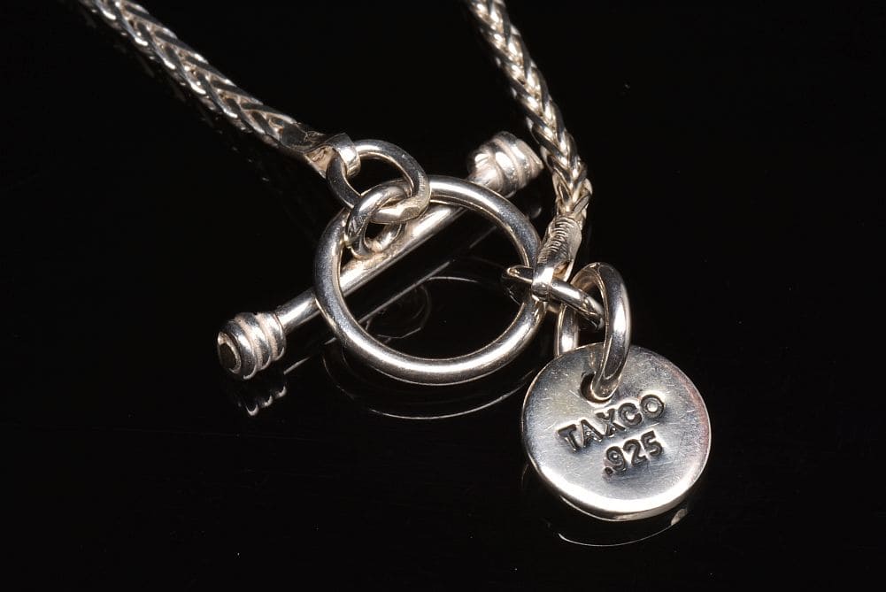 銀の街として知られるメキシコ、タスコ発祥のシルバーブランド「XOLO JEWELRY」の編み込んだ立体的なデザインが特徴の『Spike Link Necklase』でございます。プレートに僅かなスレが見られますが、目立つダメージはございません。 |
