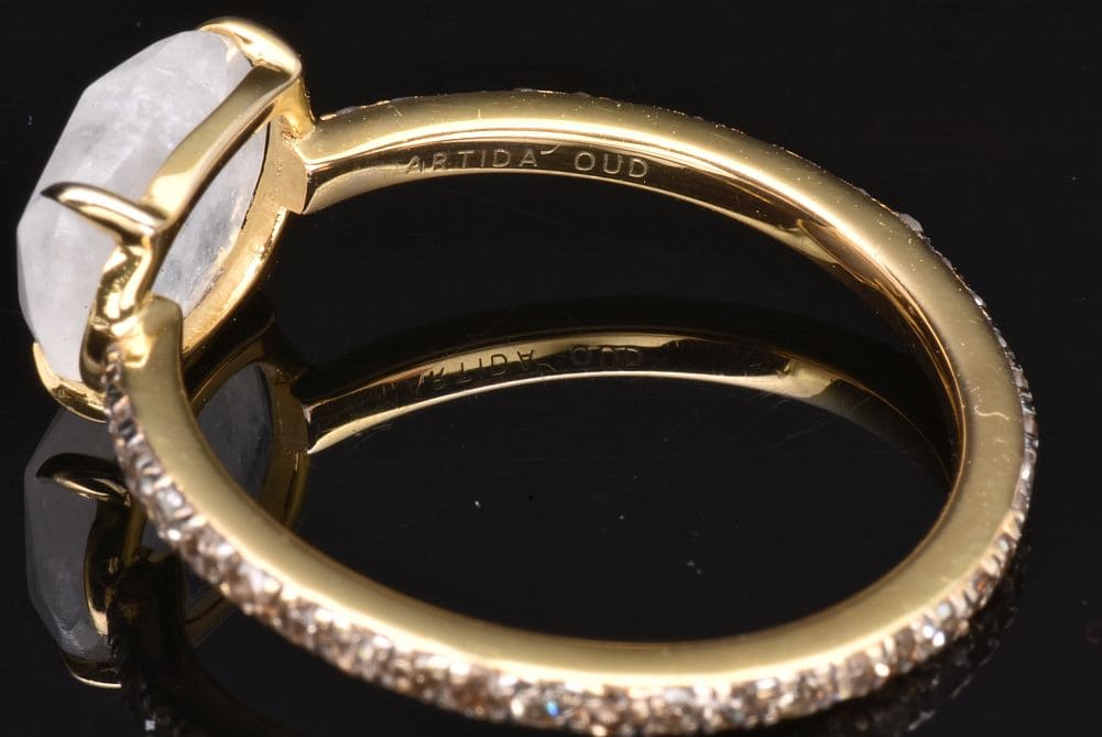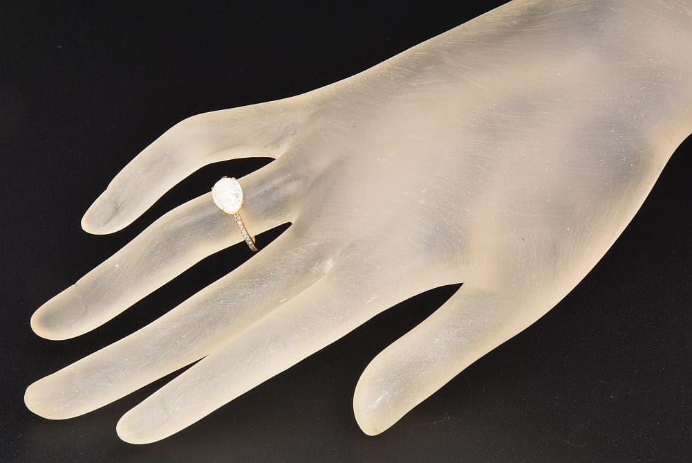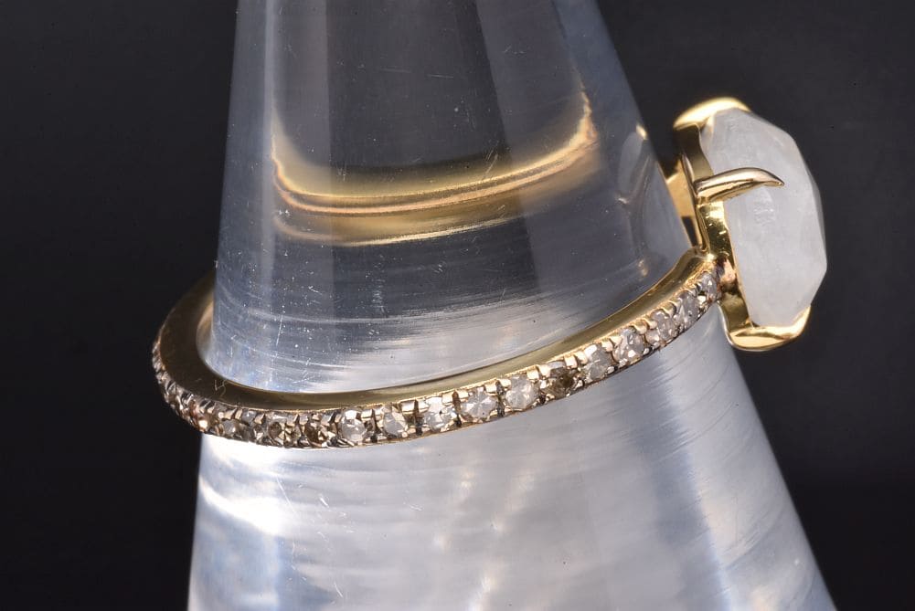 石の表面に月光を思わせる光(シラー)が浮かぶ神秘の石。虹色の強い光を放つ、爪留めされたレインボームーンストーンと、表面にブラックロジウムコーティングがされたパヴェダイヤのフルエタニティリングでございます。リング部分に僅かなスレが見られますが、目立つダメージはございません。 |