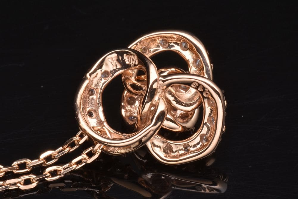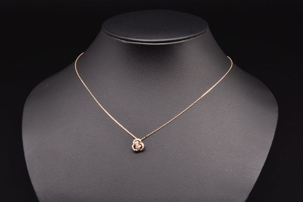 重なり合う花びらにダイヤモンドがデザインされた『ダイヤモンド クリスティーヌ ネックレス』でございます。僅かなスレが見られますが、使用感のほとんど無いキレイな状態でございます。 |
