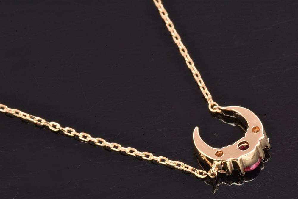 三日月型のモチーフにダイヤモンドとルビーがセットされたネックレスでございます。モチーフ背面に僅かなスレが見られますが、目立つダメージはございません。 |