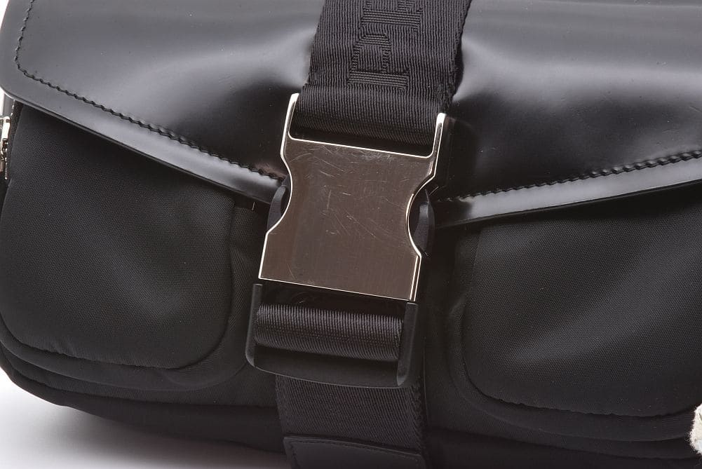 取り外し可能なショルダーストラップとポーチが付いた機能的なショルダーバッグでございます。若干の型崩れや金具・レザー部分に細かなスレが見られますが、目立つ大きなダメージはございません。 |
