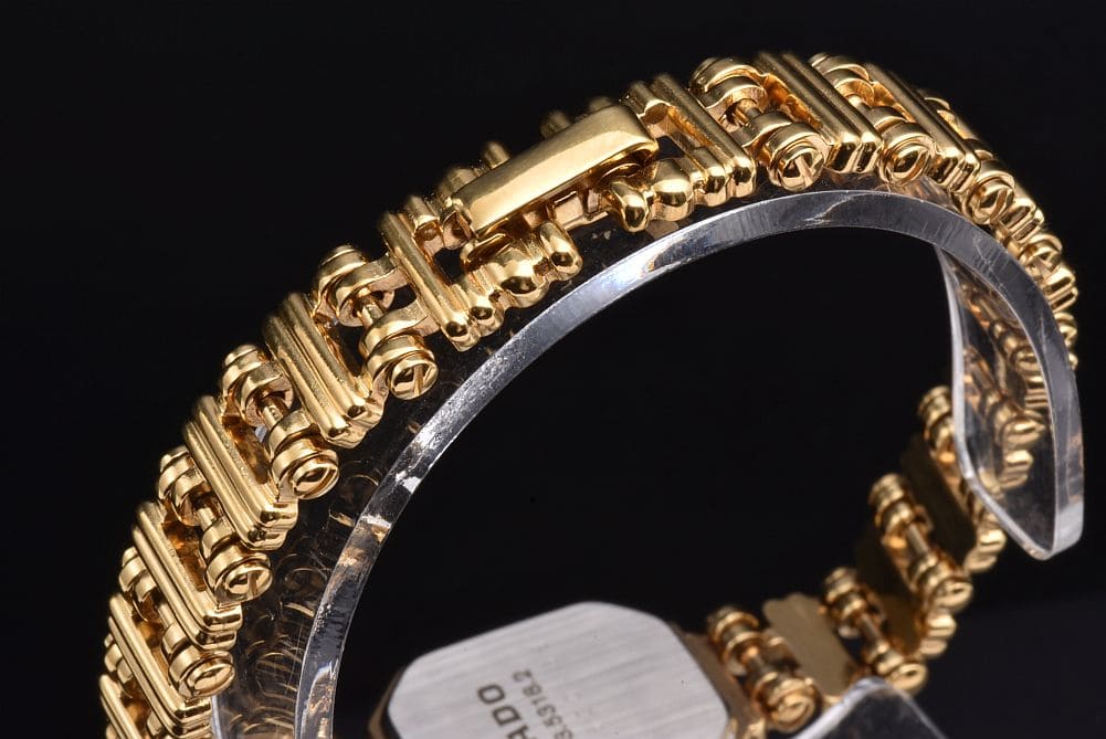 ケースとブレスレットがゴールド(GP)で統一されたダイアスター ジュビリー レディース クォーツ 133.5318.2でございます。ブレスや裏蓋などに少々のスレ傷はございますが、全体的にキレイな状態でございます。文字盤に僅かなヤケがあるものの、気になる程度では無くガラスの傷はございません。 |