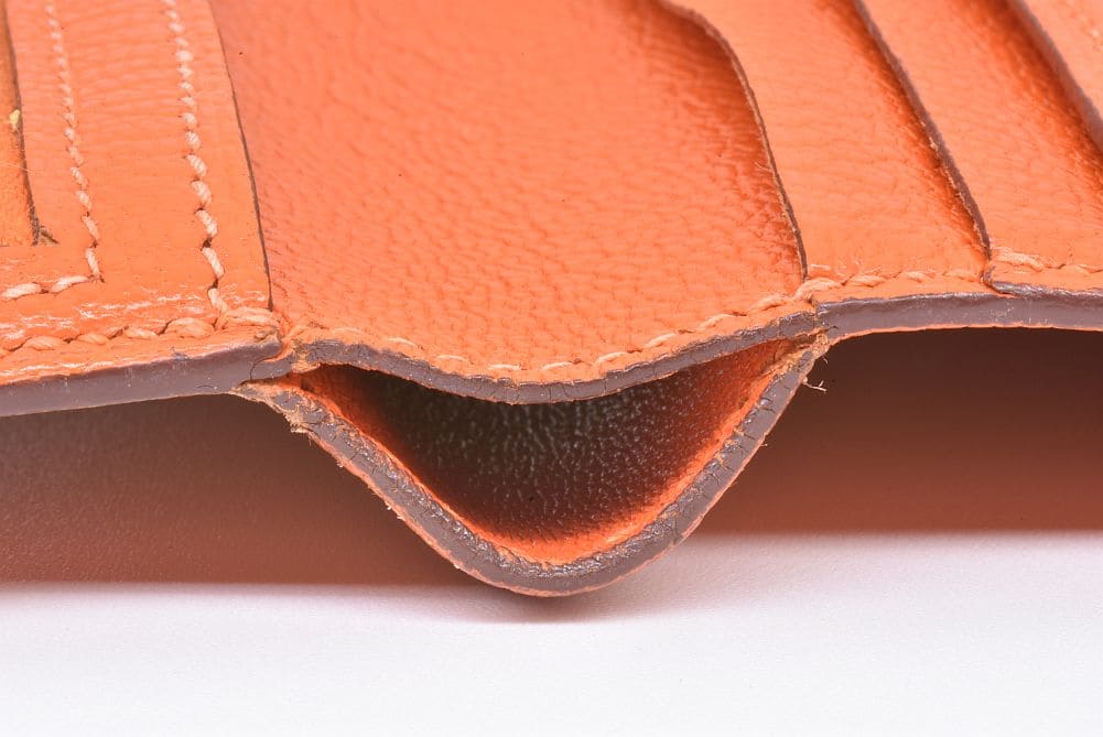 エルメスを代表するH金具とベルトが印象的な『ベアン コンパクト』でございます。表面に若干の色ヤケ、金具部分やファスナーにキズ・変色が見られます。、角スレや縁部分に糸抜けが見られる箇所がございます。小銭入れやカードポケットに収納跡がございますが、まだまだお使いいただける商品でございます。 |