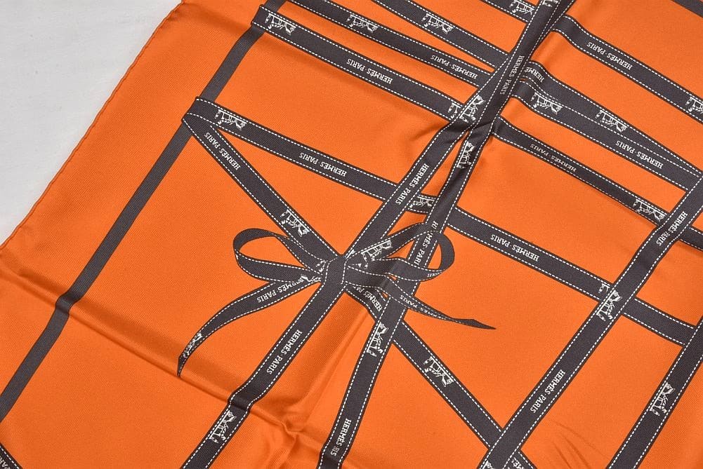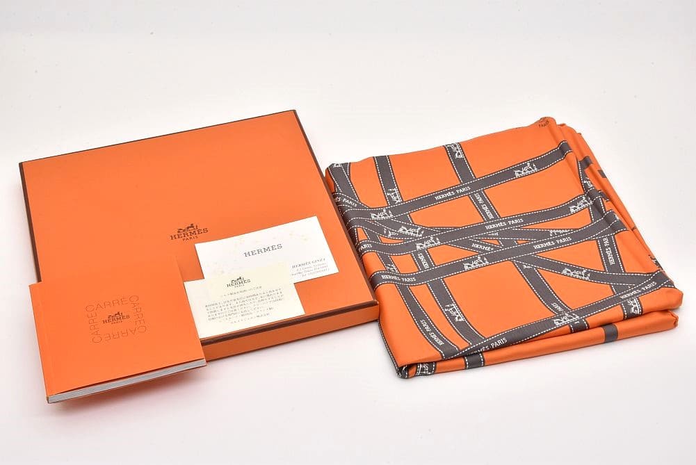 エルメスお馴染みのオレンジボックスにかかるリボンがデザインされたスカーフ『カレ90 BOLDUC RIBBON』でございます。保管による僅かなシワがございますが、未使用の商品でございます。 |