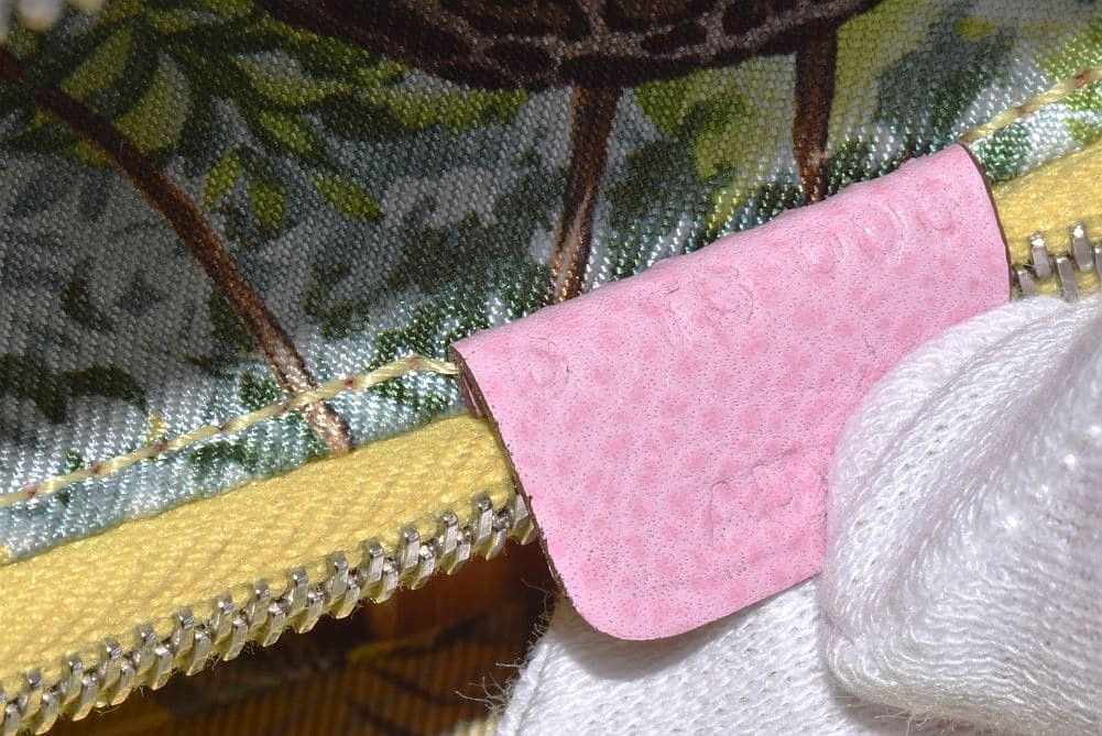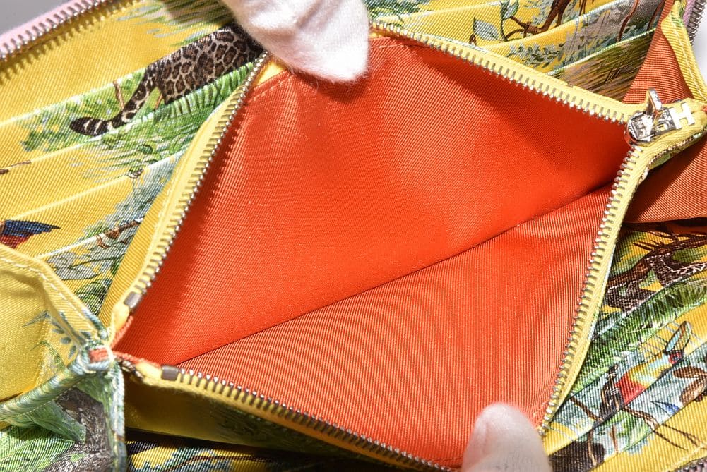 シンプルなレザーと華やかなシルクスカーフを使用した『アザップ ロング シルクイン』でございます。表面や角にスレ・汚れ、ファスナー革に使用感がございます。ファスナー付近のキャンバス地に汚れが見られますが、カードポケットや小銭入れはキレイな状態でございます。 |