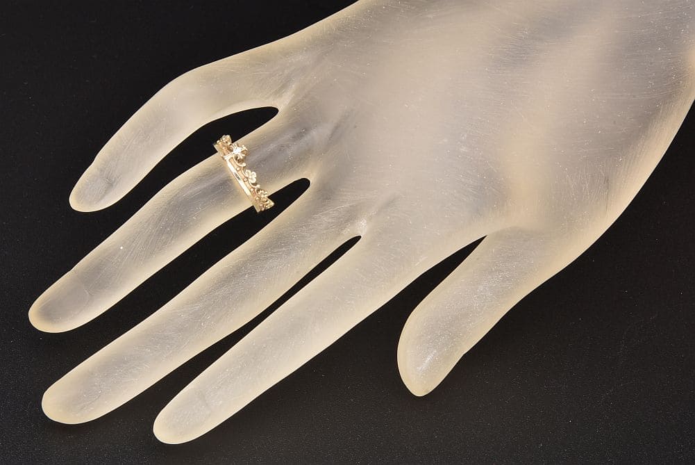 ダイヤモンドをセットしたクロスモチーフがエレガントな『CORONATION リング』でございます。表面に細かなスレやキズがございますが使用上大きく目立つようなダメージはございません。 |