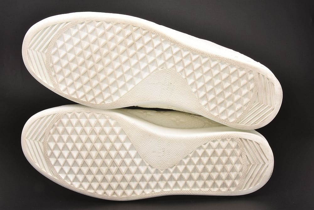 ホワイトのレザーにアイコニックなモノグラム・パターンがデザインされた『ルクセンブルグライン スニーカー』でございます。表面に少々の薄い汚れやシワ、履き口に僅かなスレが見られます。ソールに若干の削れや汚れ全体的に少々の使用感がございますが目立つダメージはございません。 |