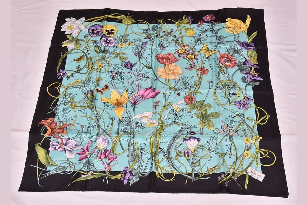グッチ フローラルプリント スカーフ カレ バンダナ 花柄 シルク ブラック ターコイズ ブルー 544617 【正規品 未使用】