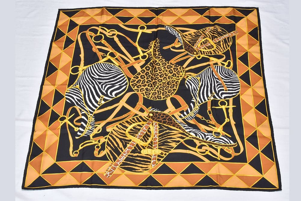 グッチ アニマル柄 スカーフ カレ バンダナ ヒョウ柄 ゼブラ柄 ブラック ブラウン イエロー