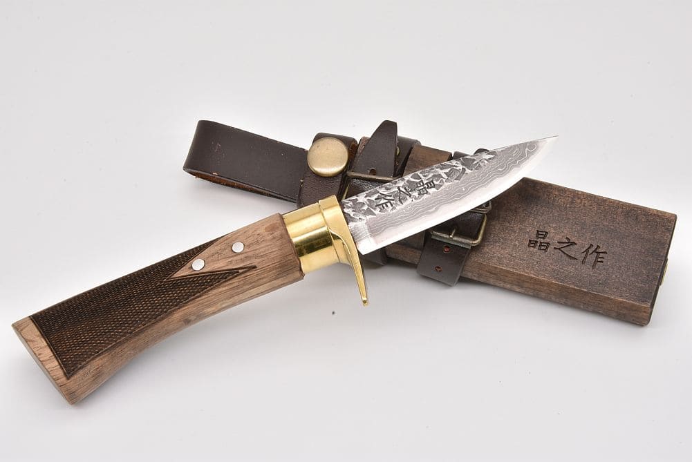 鍛冶屋トヨクニ 晶之作土佐鍛 ダマスカス豆山遊鉈80mm 剣鉈 槌目磨 真鍮ツバ サバイバルナイフ 青2鋼 両刃 bip-808【新品同様 】